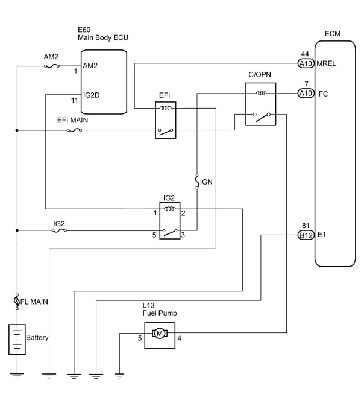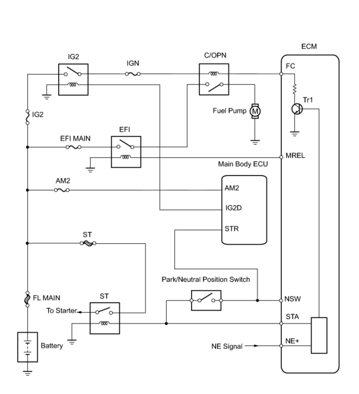 When the STA signal and NE signal are input to the ECM, Tr is turned ON, current flows to the coil of the circuit opening relay (Marking: C/OPN), the relay switches on, power is supplied to the fuel pump and the fuel pump operates.