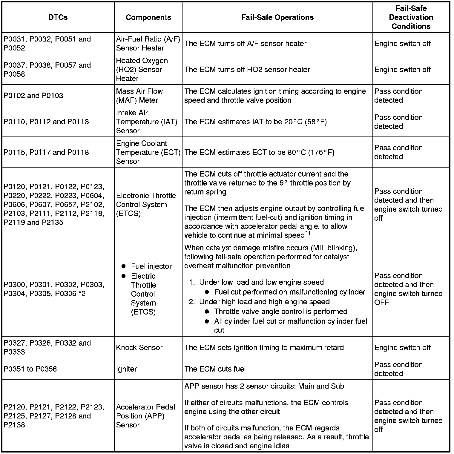 If any of the following DTCs are set, the ECM enters fail-safe mode to allow the vehicle to be driven temporarily.