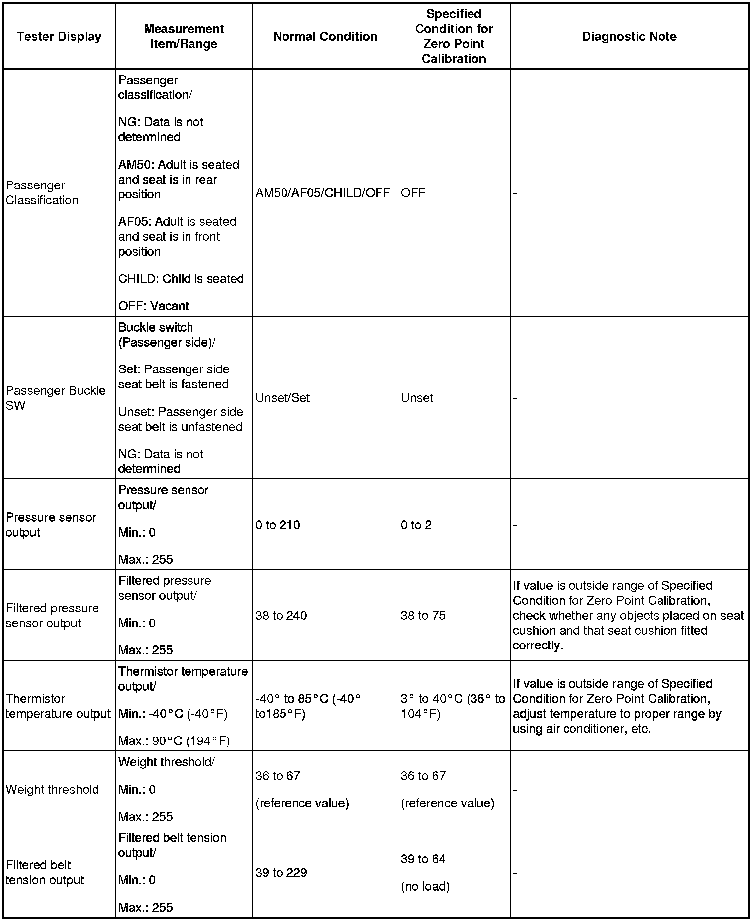1. DATA LIST FOR OCCUPANT CLASSIFICATION ECU