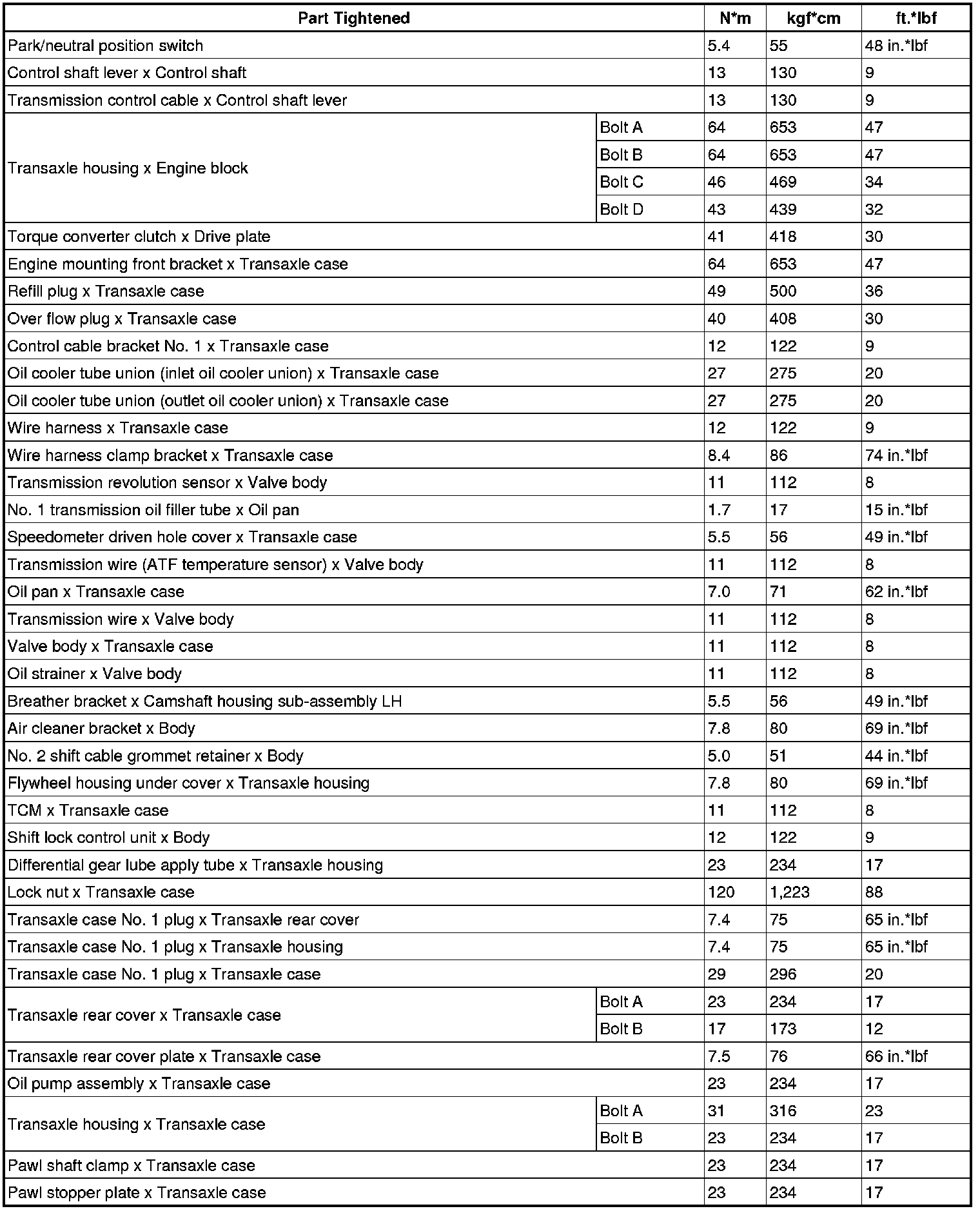 SERVICE SPECIFICATIONS: U660E AUTOMATIC TRANSAXLE: TORQUE SPECIFICATIONS