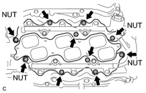 Install and tighten the 6 bolts and 4 nuts uniformly in several steps.