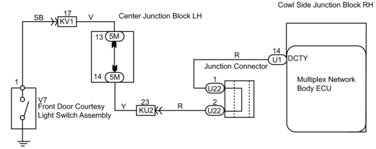 4. CHECK WIRE HARNESS (MULTIPLEX NETWORK BODY ECU - FRONT COURTESY LIGHT SWITCH)