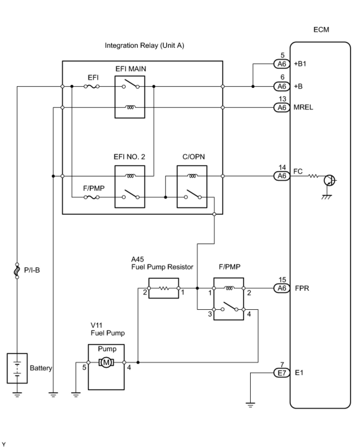 When the engine is cranked, a signal is sent from the power source control ECU's STSW terminal to the ECM's STSW terminal. Then voltage travels from the ECM's STAR terminal through the park/neutral position switch to the STARTER relay coil. The STAR terminal also sends a signal to the STA terminal. When the STA signal and NE signal are input to the ECM, the ECM interior's Tr1 turns on, which causes power to be supplied to the C/OPN relay coil (C/OPN on). As a result, the F/PMP relay actuates, which causes the fuel pump to operate. If the engine is operating and NE signals are being output, the ECM interior's Tr1 is on (C/OPN on), and the fuel pump will continue operating. The fuel pump has a high and low speed setting. When the engine is starting or operating with a heavy load, the ECM interior's Tr2 turns on to actuate the F/PMP relay so that the fuel pump operates at the high speed setting. When the engine is idling or operating with a light load, the Tr2 turns off, and current flows through the fuel pump resistor to the fuel pump so that the fuel pump operates at the low speed setting.