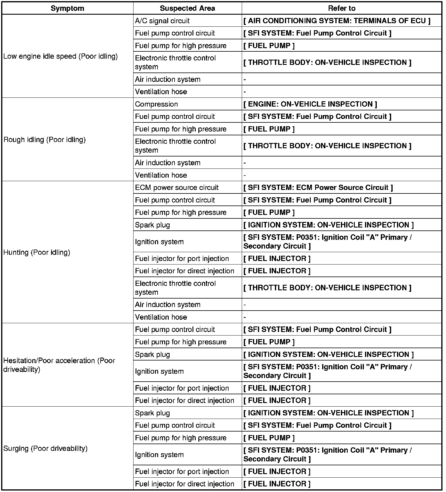 2GR-FSE ENGINE CONTROL SYSTEM: SFI SYSTEM: PROBLEM SYMPTOMS TABLE