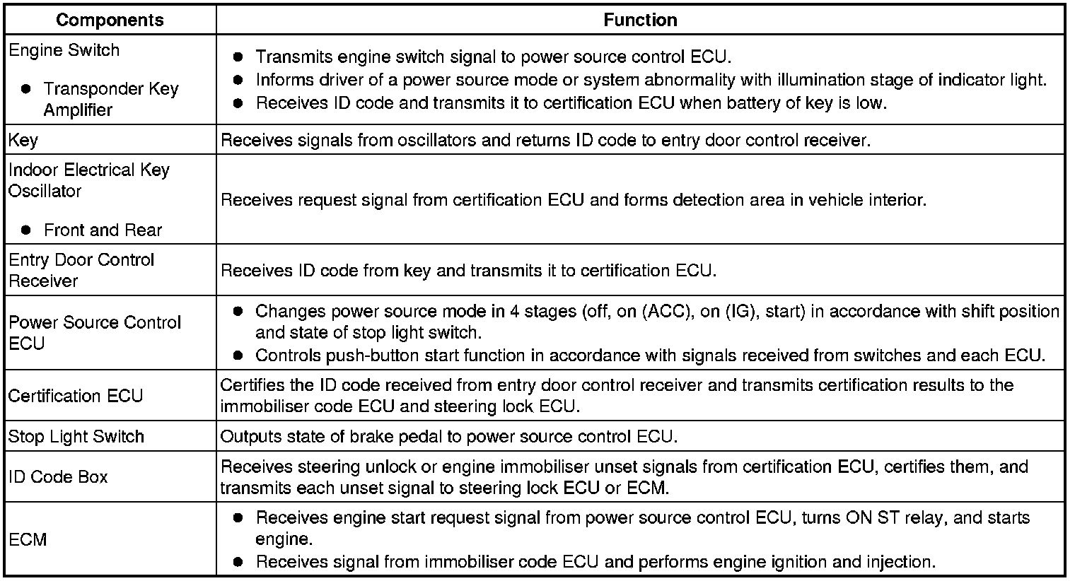 (a) The push-button start uses a push-type engine switch, which the driver can operate by merely carrying the key. This system consists primarily of the power source control ECU, engine switch, ID code box, steering lock ECU, key, ACC relay, IG1 relay, IG2 relay and certification ECU. The power source control ECU controls the system. This function operates in cooperation with the smart access system. The table below shows the transition of the engine switch, which depends on whether the brake pedal is depressed or released.