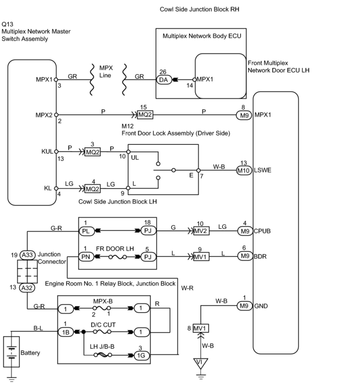 The multiplex network body ECU receives switch signals from the multiplex network master switch and driver side door key cylinder, and activates the door lock motor on each door according to the signals.