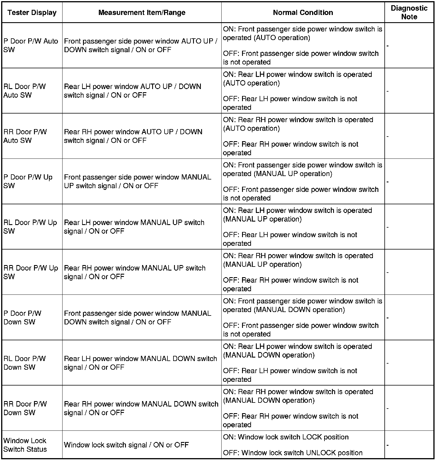 When the engine switch on (IG) and the window lock switch is OFF, the power window master switch sends remote up / down signal to each power window regulator motor via the LIN communication line.