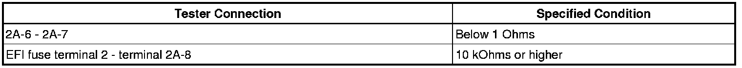 (2) Connect a battery's positive (+) lead to terminal 2A-6 and negative (-) lead to terminal 2A-7. Measure the resistance between EFI fuse terminal 2 and terminal 2A-8 when battery voltage is applied between the terminals.