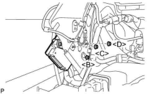 (f) Pass temporarily installed nut B through the body hole (on the left side of the luggage compartment) and slide the seat belt control ECU downward to position it together with the junction block assembly.