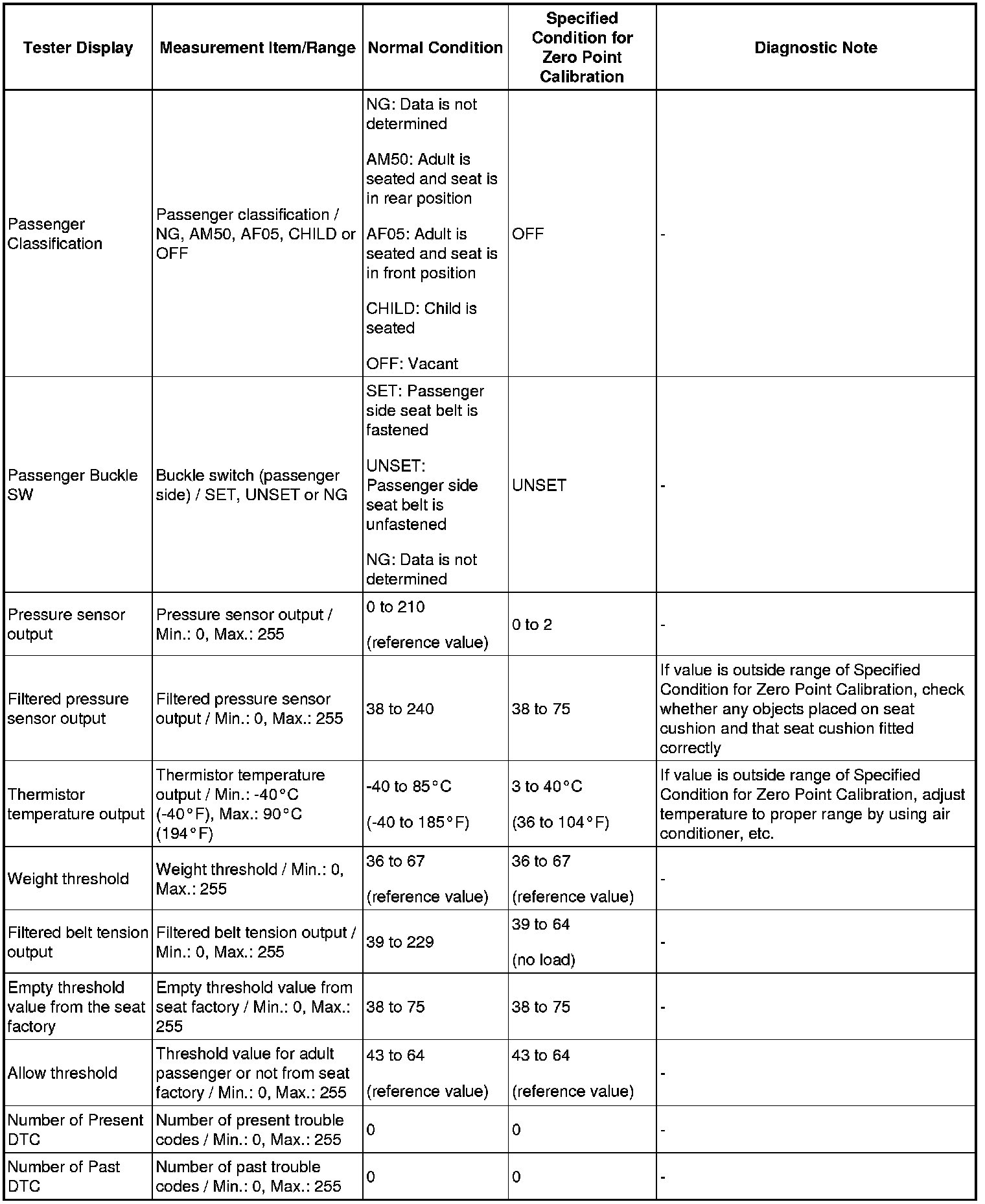 1. DATA LIST FOR OCCUPANT CLASSIFICATION ECU