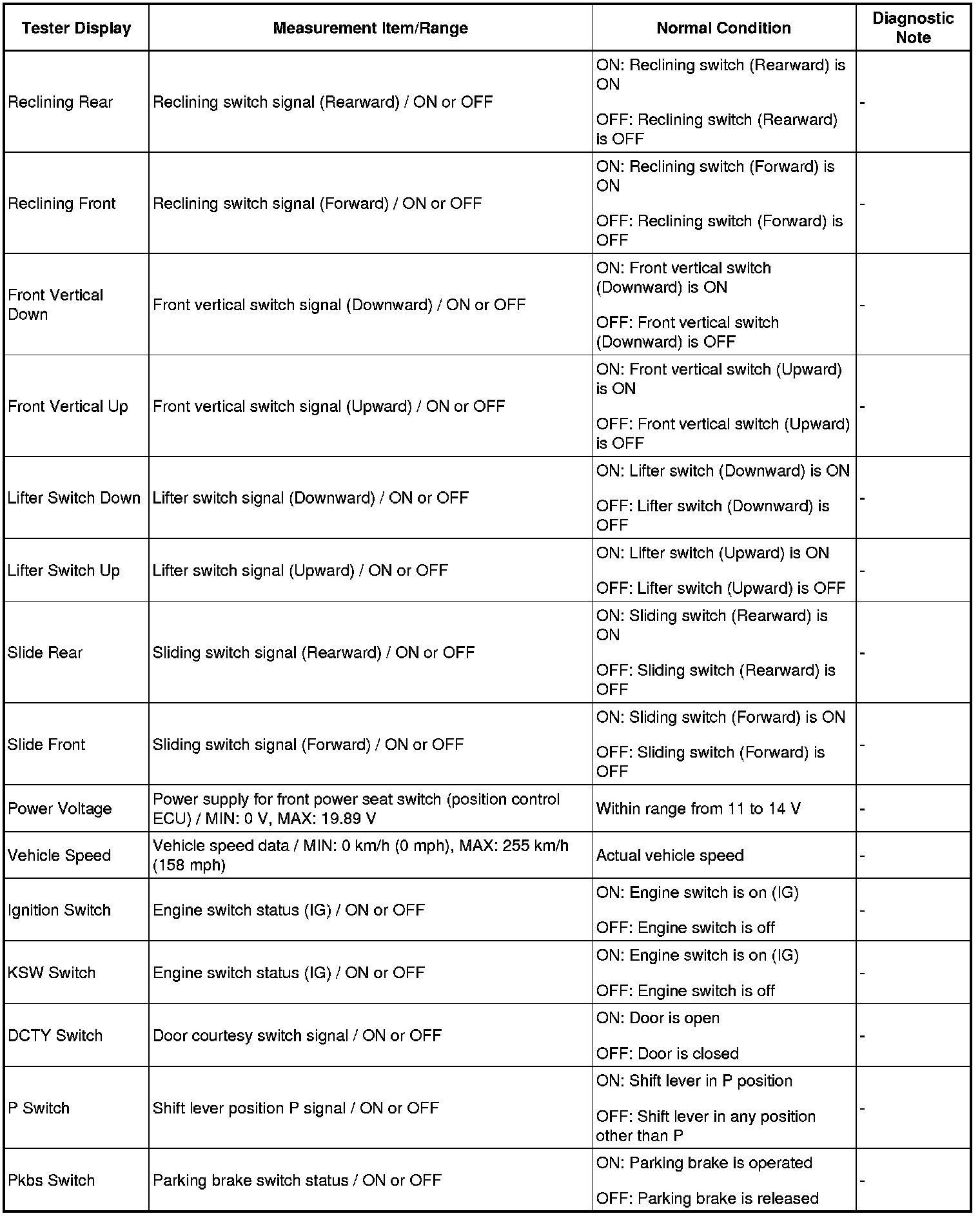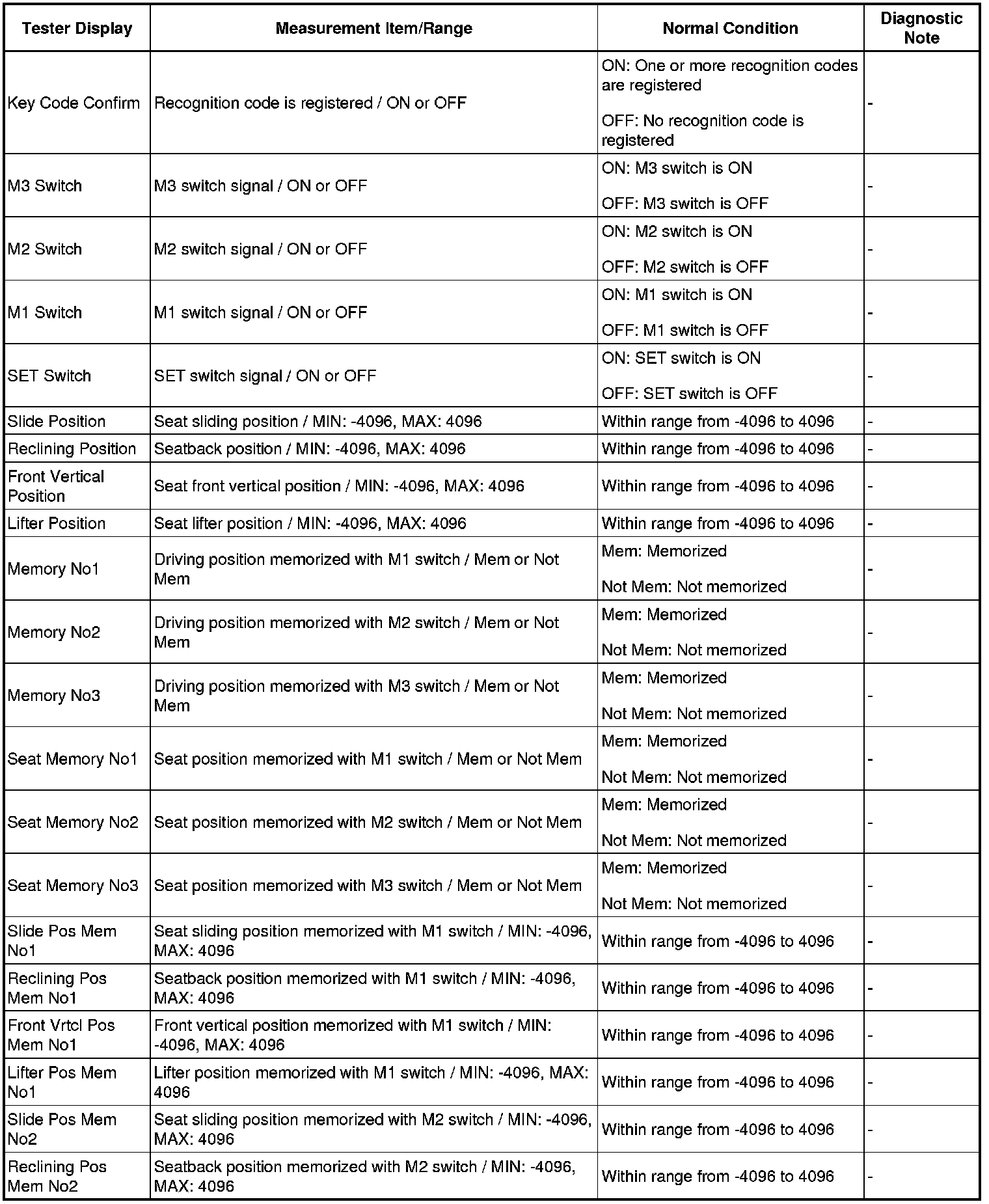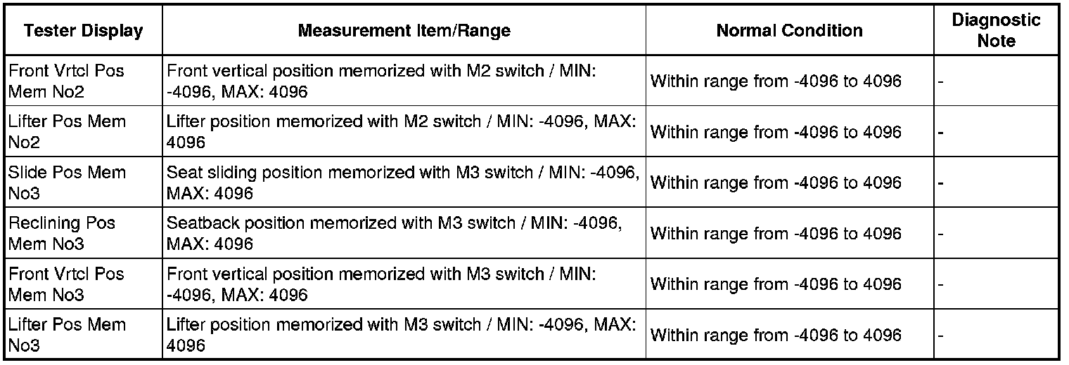 SEAT: FRONT POWER SEAT CONTROL SYSTEM (w/ Seat Position Memory System): DATA LIST / ACTIVE TEST