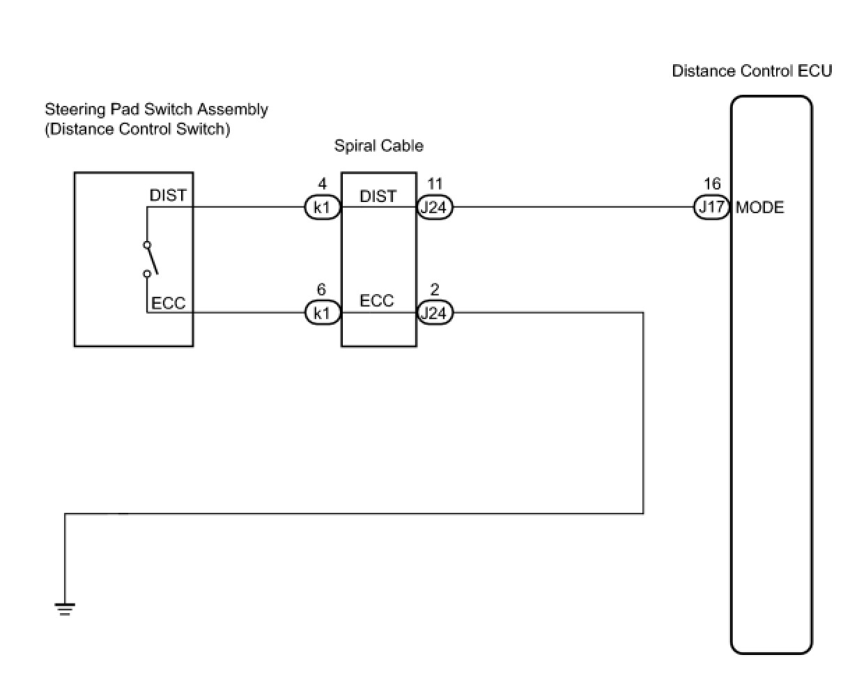 The distance control switch sets the vehicle-to-vehicle distance control mode. The distance control switch is installed in the steering pad switch. The vehicle-to-vehicle distance set value can be changed by operating the steering pad switch (distance control switch) while the dynamic radar cruise control system is in operation. The steering pad switch uses the BEAN to communicate with each ECU. Therefore, it does not have a direct connection with the ECM. If there are any malfunctions in the communication line of the steering pad switch, one or more DTCs in the multiplex communication system are output.