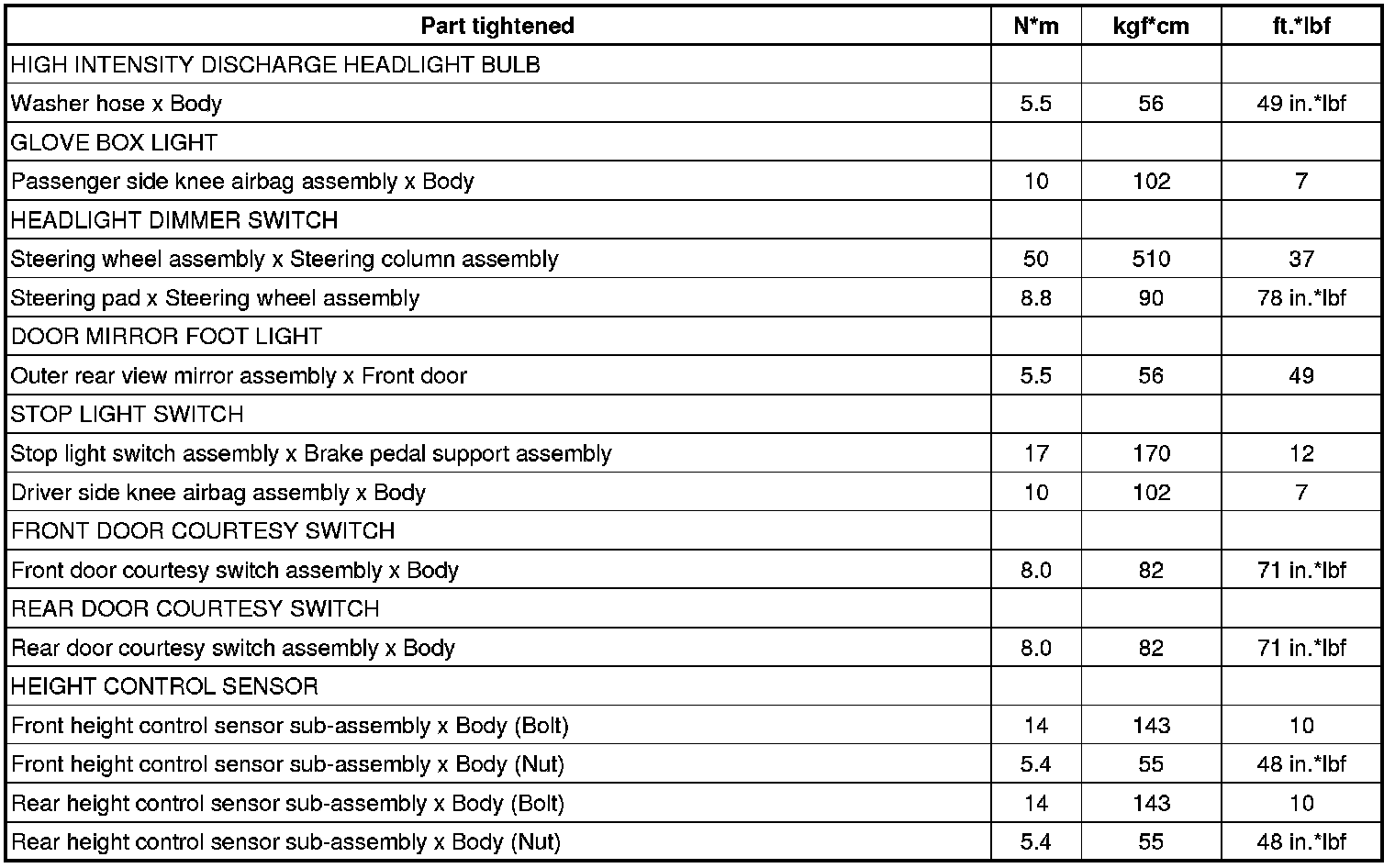SERVICE SPECIFICATIONS: LIGHTING: TORQUE SPECIFICATIONS