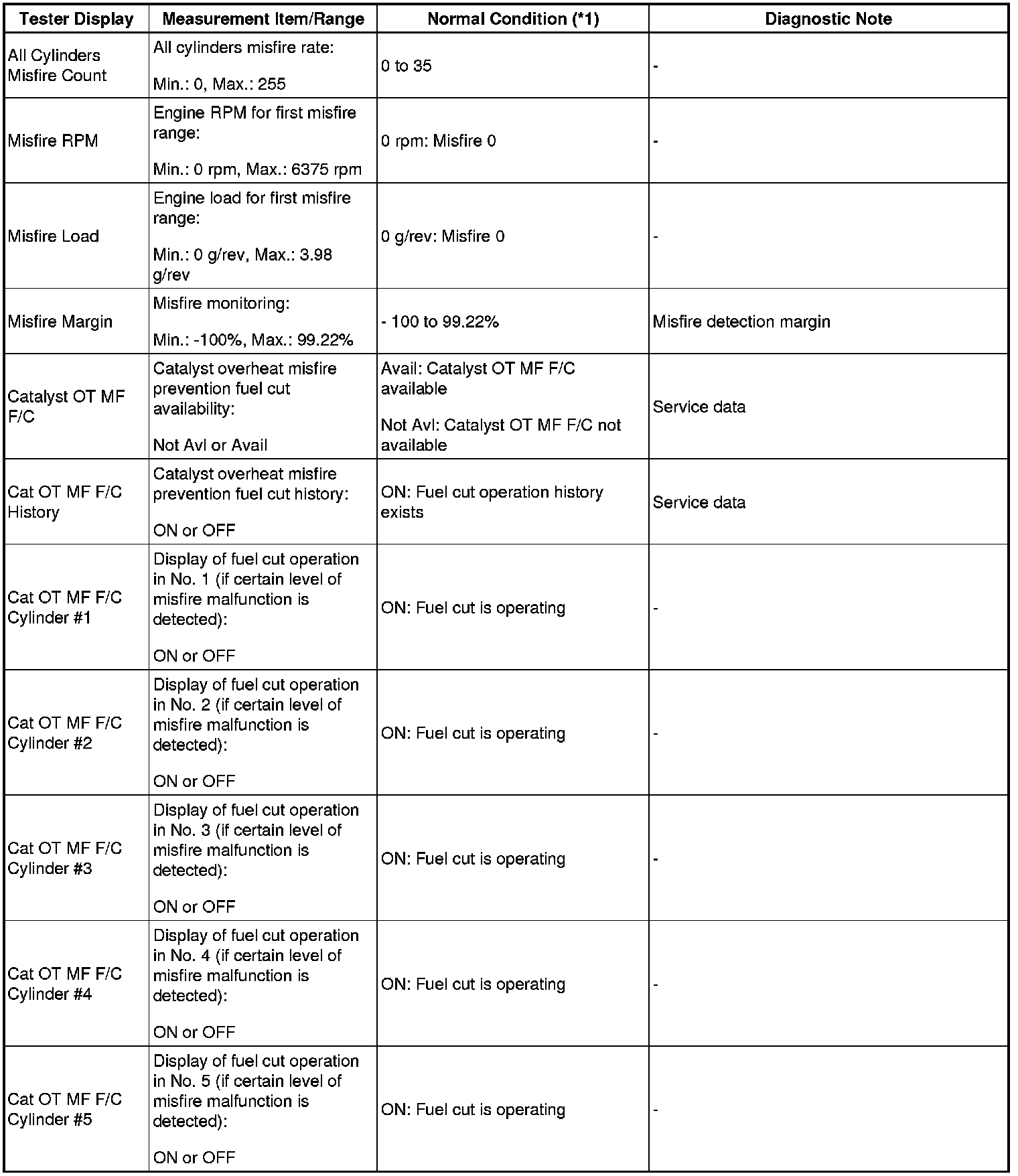 - *1: If the display of the Data List's Catalyst OT MF F/C item is Not Avl, perform this Active Test with the vehicle stopped and the engine idling. If the display of the Data List's Catalyst OT MF F/C item is Avail, perform this Active Test as described below.
