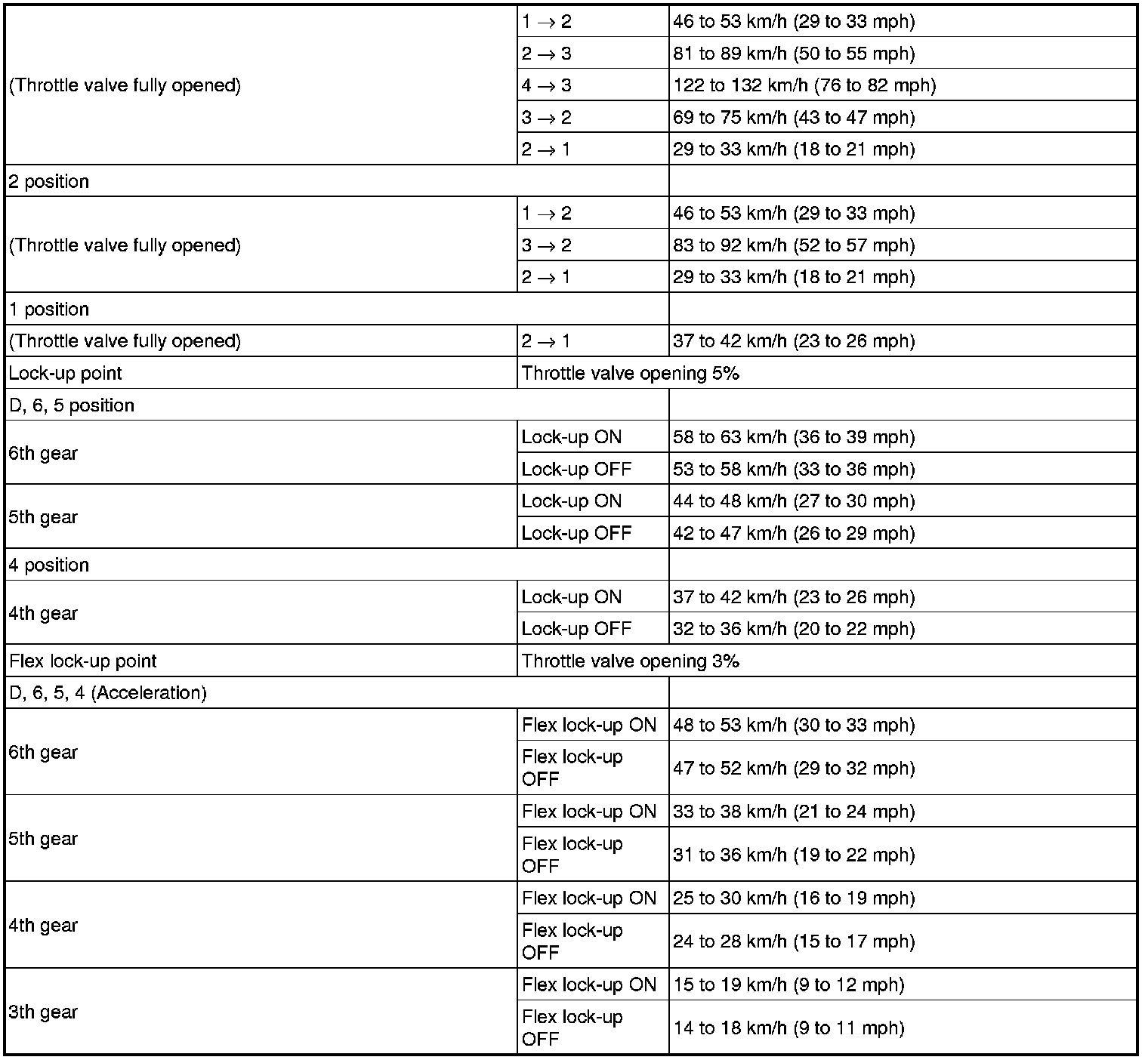 - All shift point values indicated in the above tables are actual values. Therefore, if checking a shift point with a chassis dynamometer, keep in mind that there is a range of error in the chassis dynamometer indication.