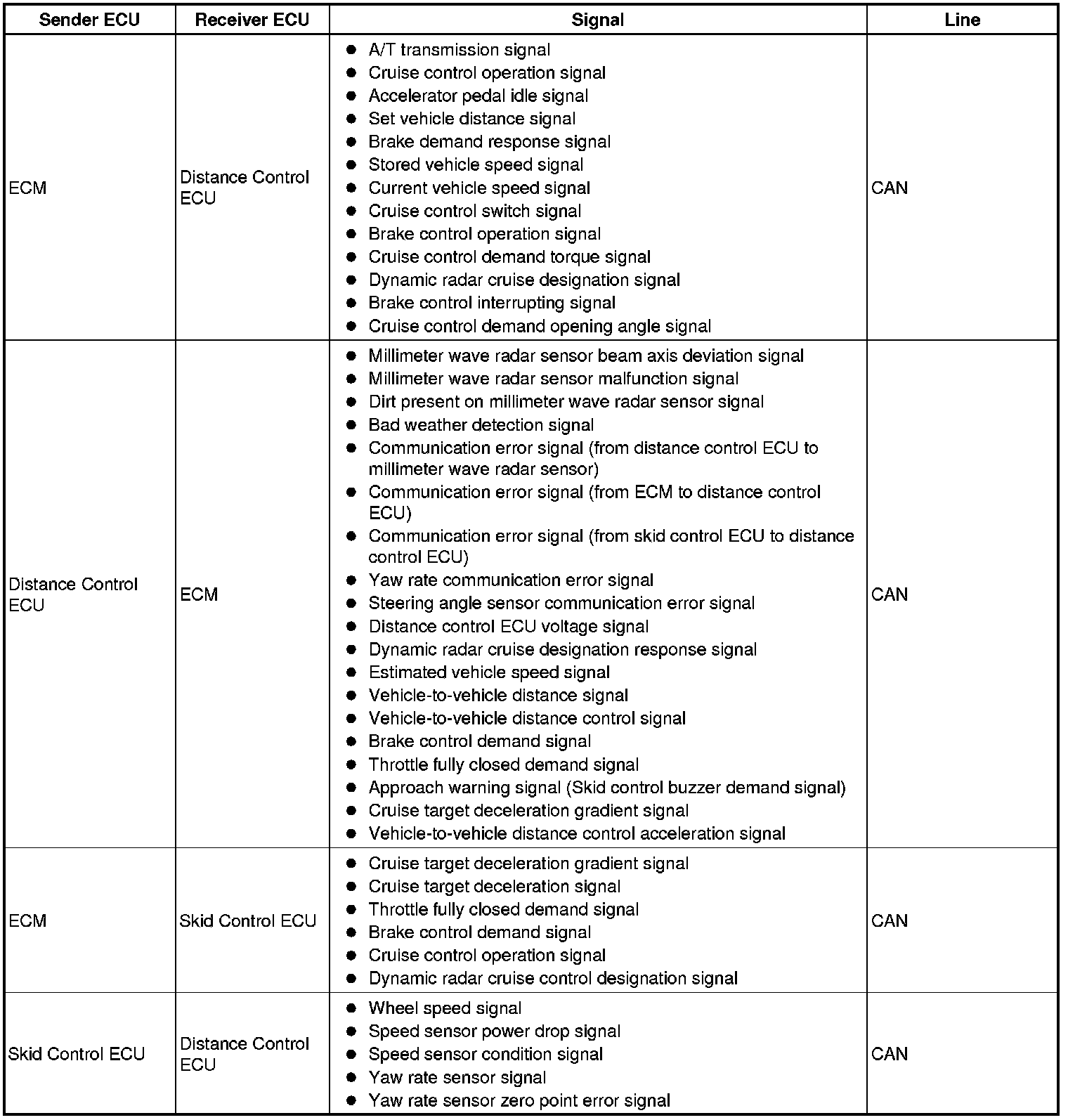 The cruise control ECU (distance control ECU) determines the distance to the vehicle in front, relative speed, target decreasing speed, and deceleration rate. Based on these data, the ECU transmits a brake demand signal to the skid control ECU via the ECM.