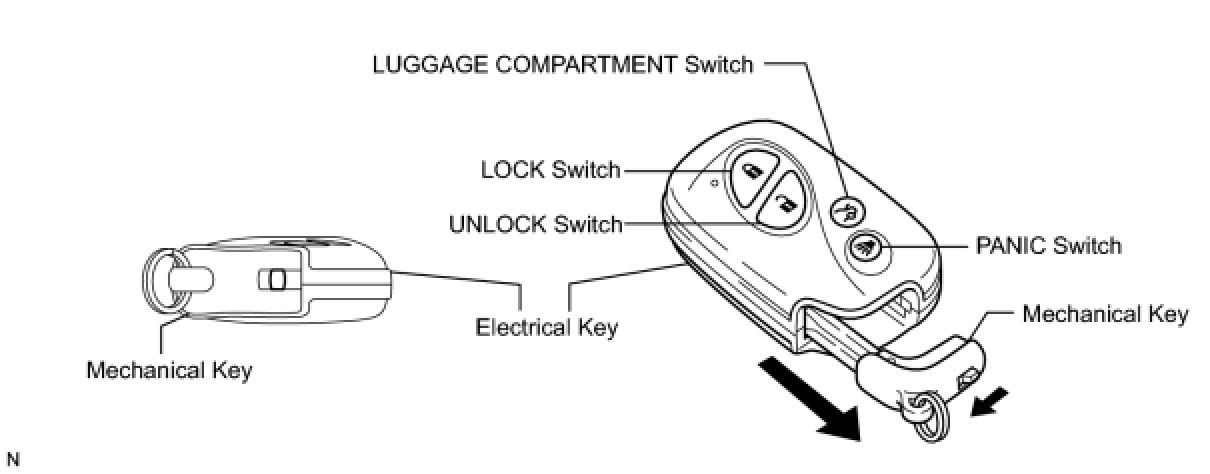 - The transmitter function for the wireless door lock control has a LOCK switch, UNLOCK switch, LUGGAGE COMPARTMENT switch, and PANIC switch.