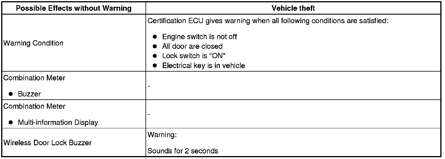 When any of the situations below occur, the smart access system with push-button start causes the certification ECU to sound the buzzer in the combination meter and the wireless door lock buzzer, and illuminate the combination meter's multi-information display in order to alert the driver.