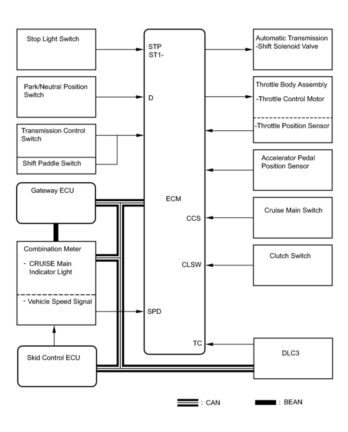 - The ECM cancels the cruise control system when the shift lever is moved from the D to the N position or the transmission is shifted to the 3rd, 2nd, or 1st gear with the shift lever in the S position, and the ECM receives a park/neutral position switch signal (for Automatic Transaxle).