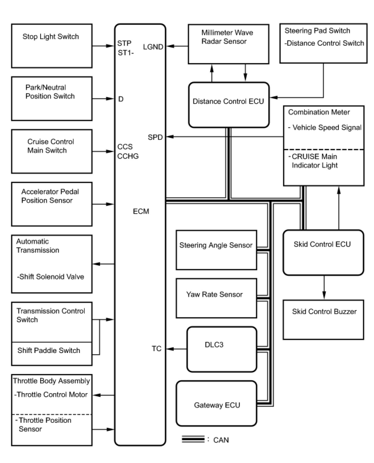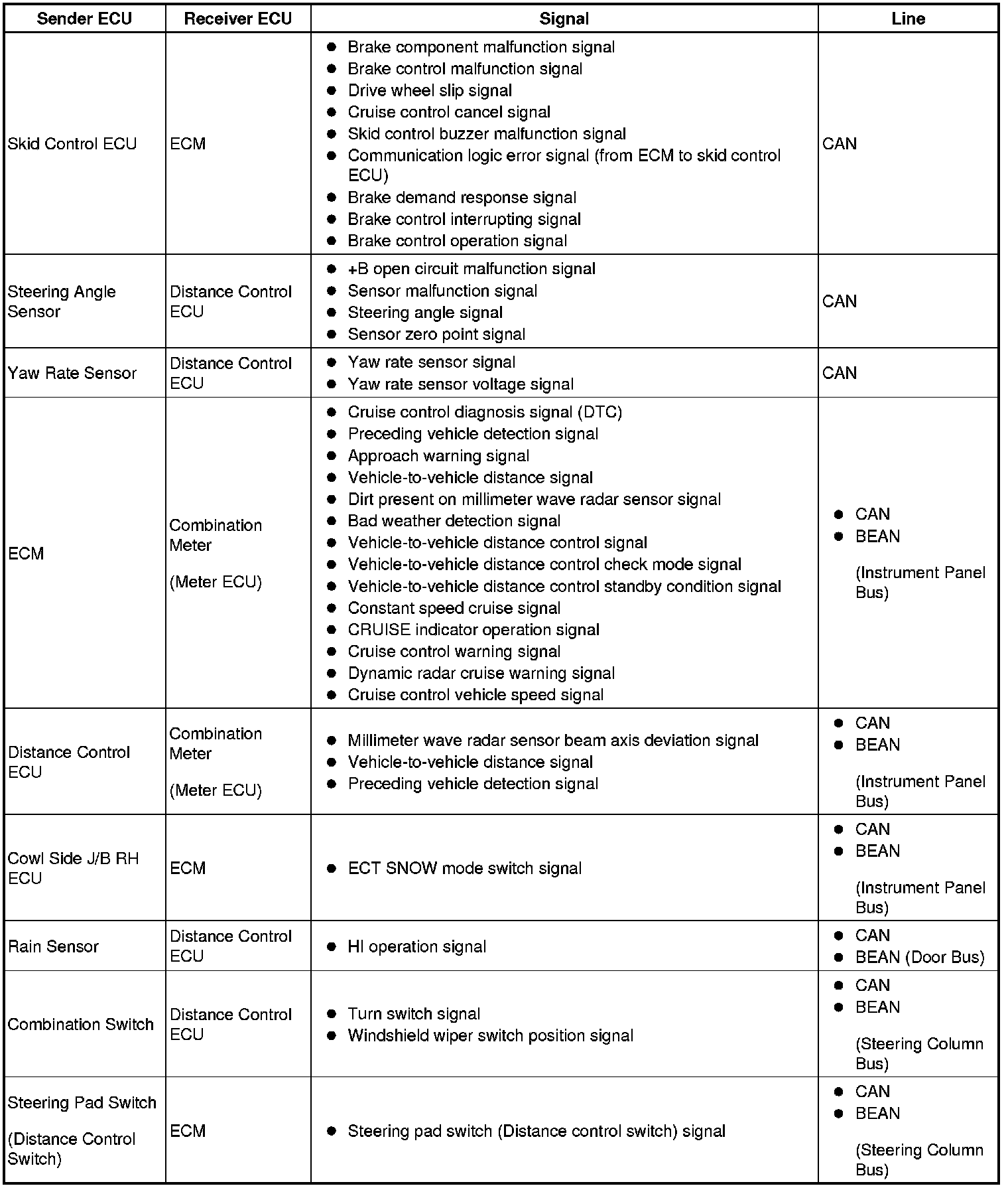 The cruise control ECU (distance control ECU) determines the distance to the vehicle in front, relative speed, target decreasing speed, and deceleration rate. Based on these data, the ECU transmits a brake demand signal to the skid control ECU via the ECM.
