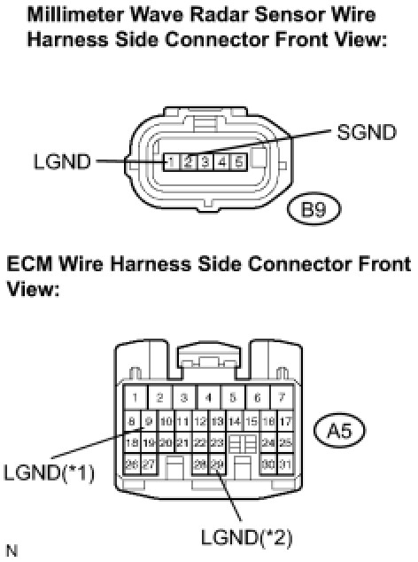 This circuit provides power to the millimeter wave radar sensor. The millimeter wave radar sensor emits radio waves towards an object in front and measures the distance and direction of the object by receiving the beam reflections. Based on the reflections, the sensor calculates the difference in speed between the vehicle and the object in front. This data is transmitted to the distance control ECU. The ECU recognizes the millimeter wave radar sensor via terminals LGND. If an open circuit occurs in the wire harness between terminals LGND, the ECM cannot recognize the millimeter wave radar sensor. The ECM will stop the control of the vehicle-to-vehicle distance control mode and only the constant speed control mode can be used.