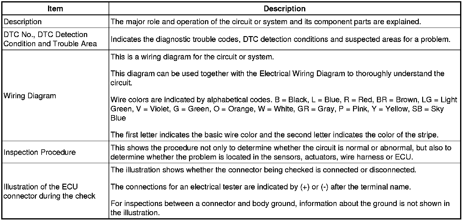 When no DTC is output but the problem still occurs, use the Problem Symptoms Table. The suspected areas (circuits or parts) for each problem symptom are shown in the table. The suspected areas are listed in order of probability. A description of each of the table columns is shown in the following table.