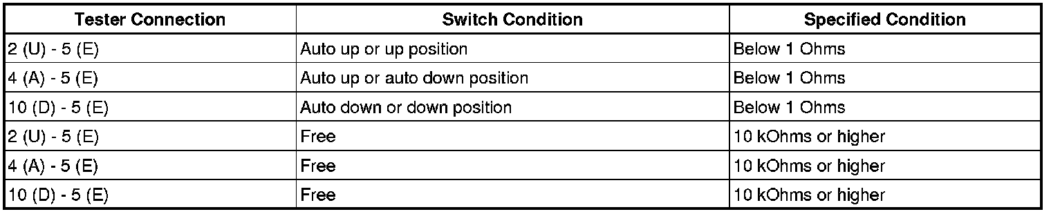 If the result is not as specified, replace the rear power window regulator switch assembly (for rear LH side).
