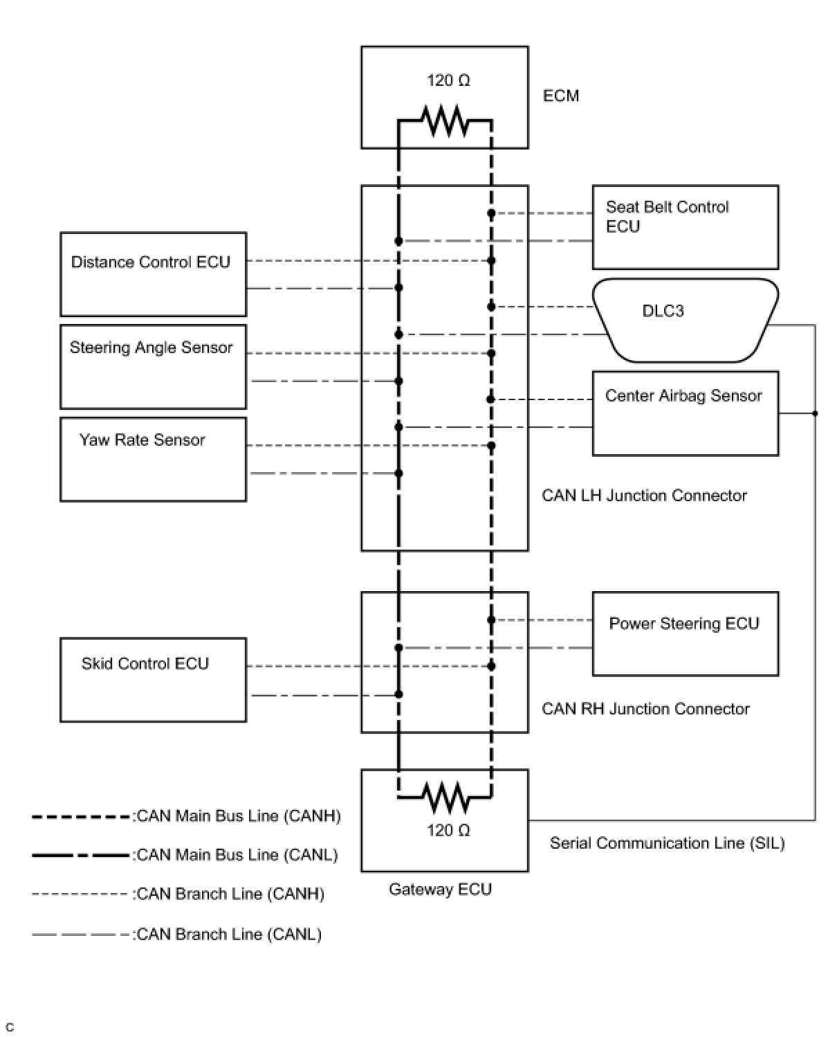 (1) Two resistors of 120 Ohms resistance are installed in parallel across the ends of the CAN main bus lines. They are called terminating resistors. These resistors allow the changes of the voltage differential between the CAN bus lines to be accurately judged. To allow proper function of CAN communication, it is necessary to have both terminating resistors installed. Since the two resistors are installed in parallel, a measurement of resistance between the two CAN bus lines should produce a reading of approximately 60 Ohms.
