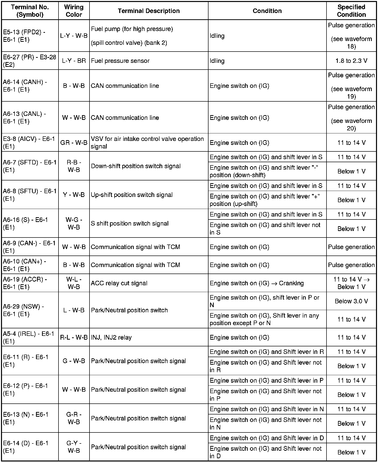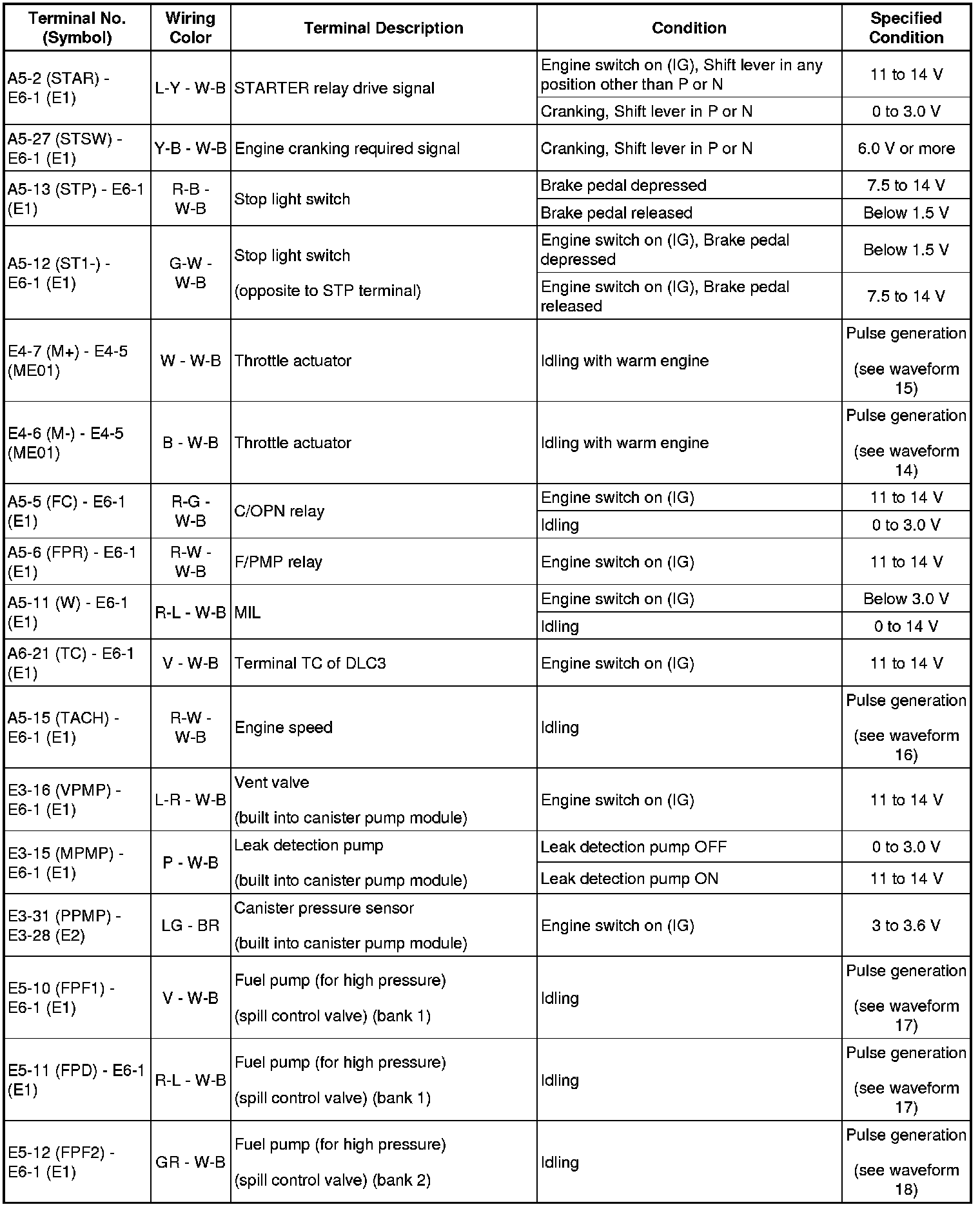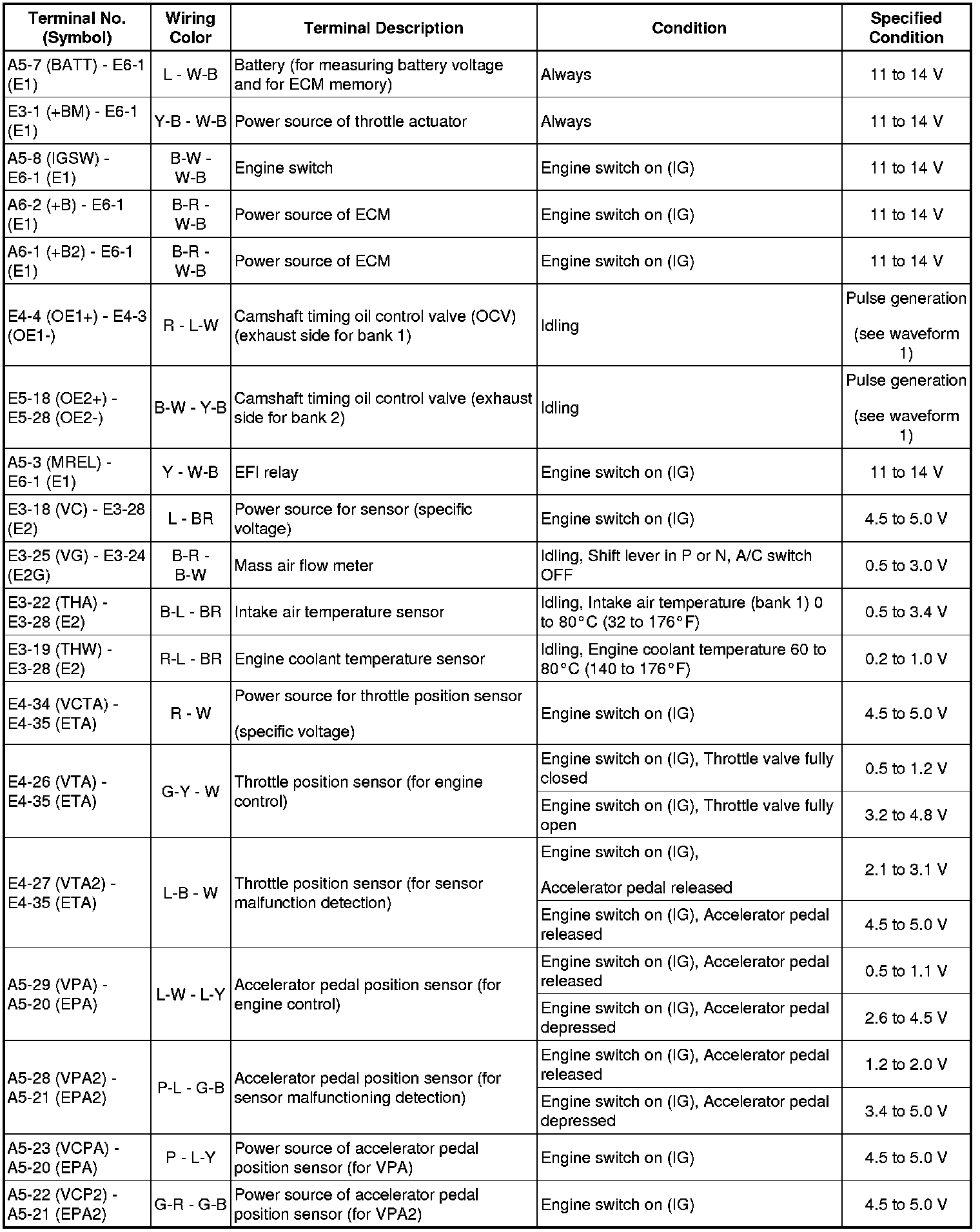 HINT: The standard normal voltage between each pair of the ECM terminals is shown in the table below. The appropriate conditions for checking each pair of the terminals are also indicated. The result of checks should be compared with the standard normal voltage for that pair of terminals, displayed in the Specified Condition column. The illustration above can be used as a reference to identify the ECM terminal locations.