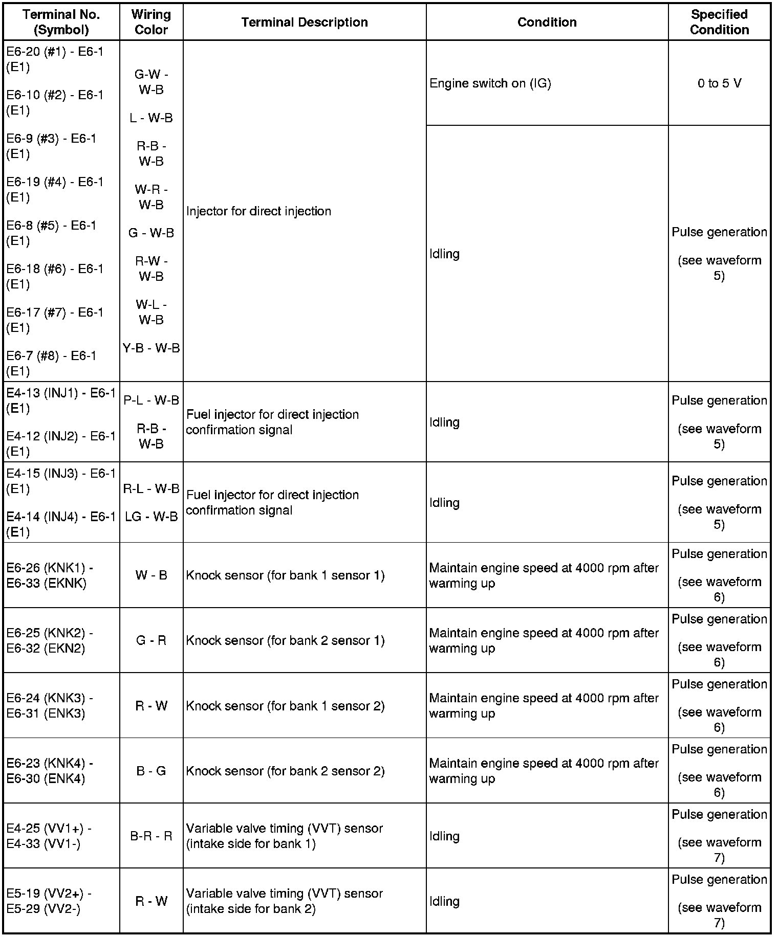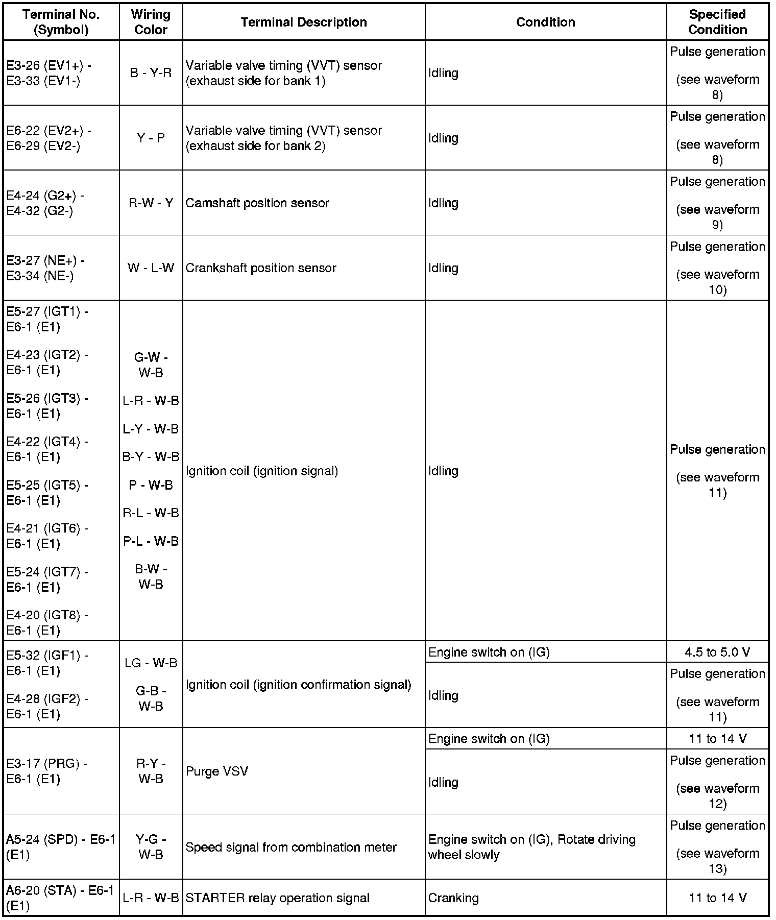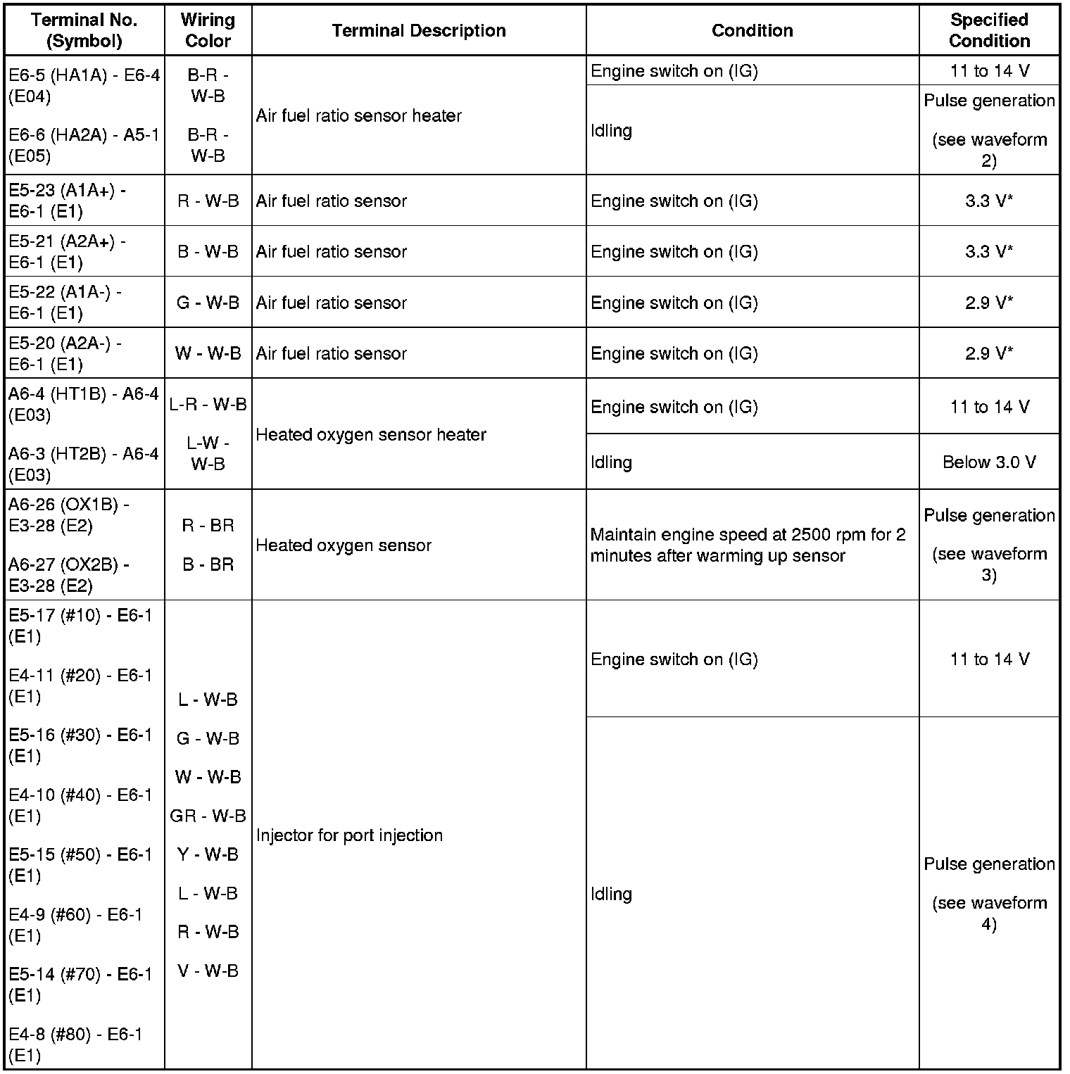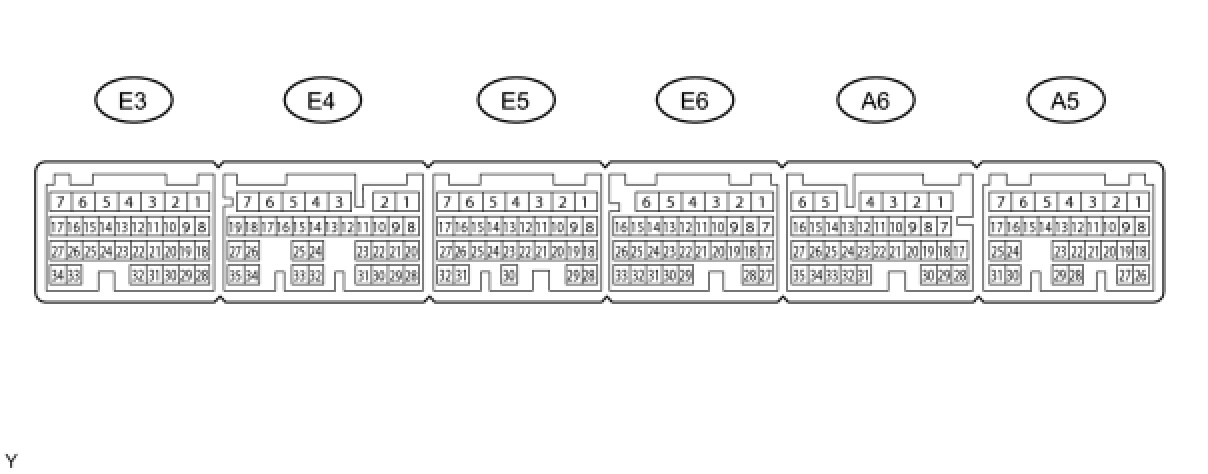 HINT: The standard normal voltage between each pair of the ECM terminals is shown in the table below. The appropriate conditions for checking each pair of the terminals are also indicated. The result of checks should be compared with the standard normal voltage for that pair of terminals, displayed in the Specified Condition column. The illustration above can be used as a reference to identify the ECM terminal locations.