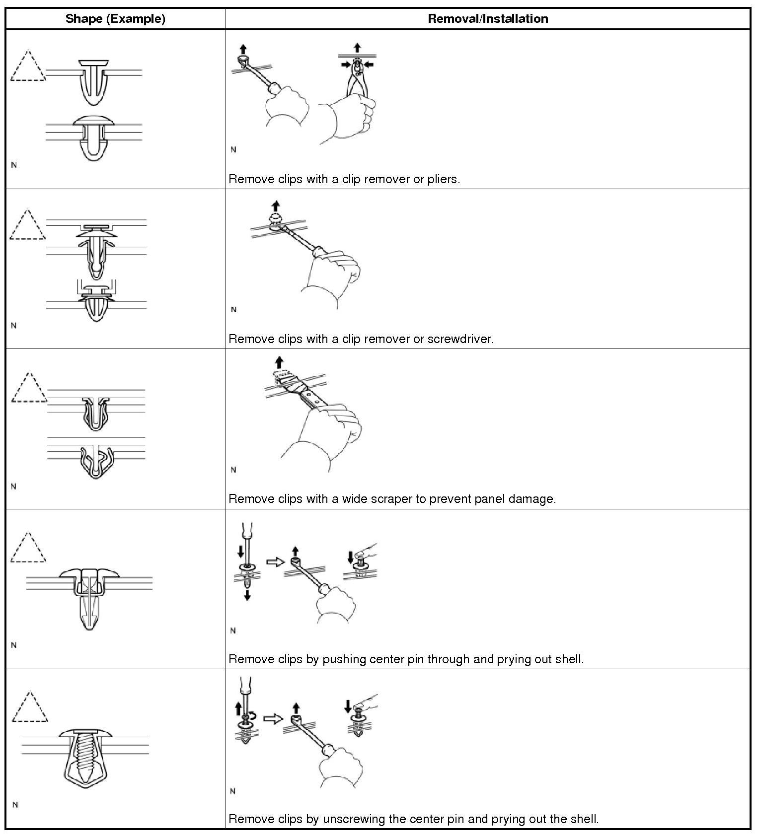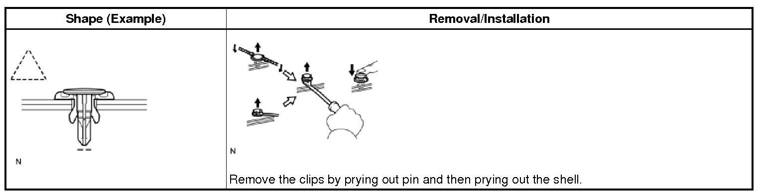 (1) The removal and installation methods of typical clips used for vehicle body parts are shown in the table below.
