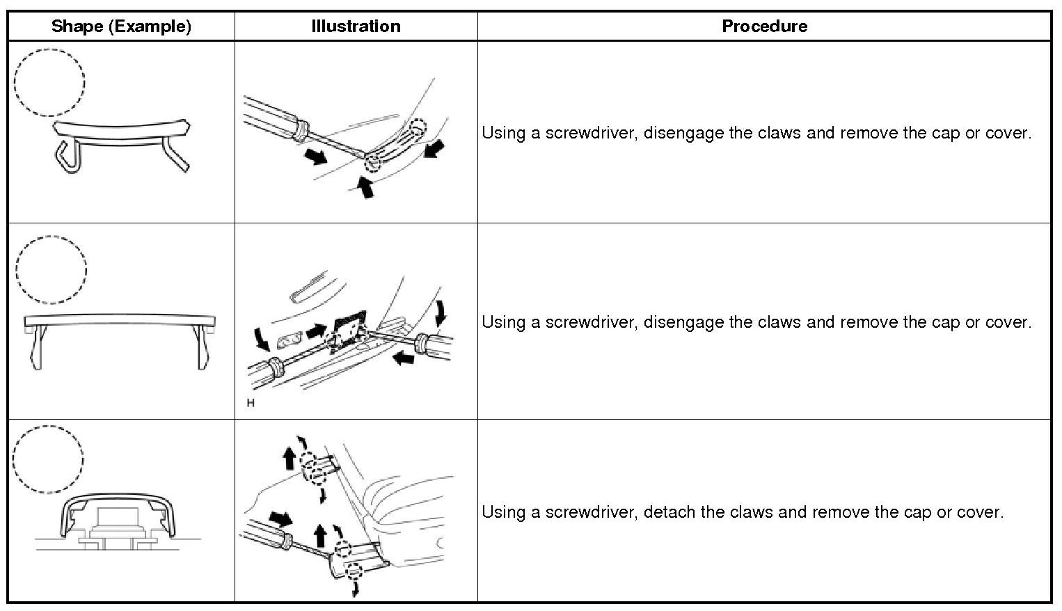 (1) The removal and installation methods of typical claws used for vehicle body parts are shown in the table below.