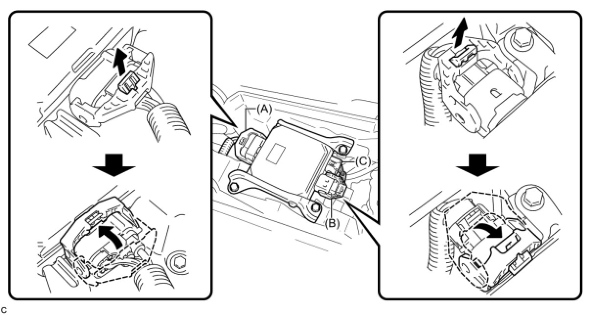 (b) Disconnect the connectors (A), (B) and (C) from the power steering ECU assembly.