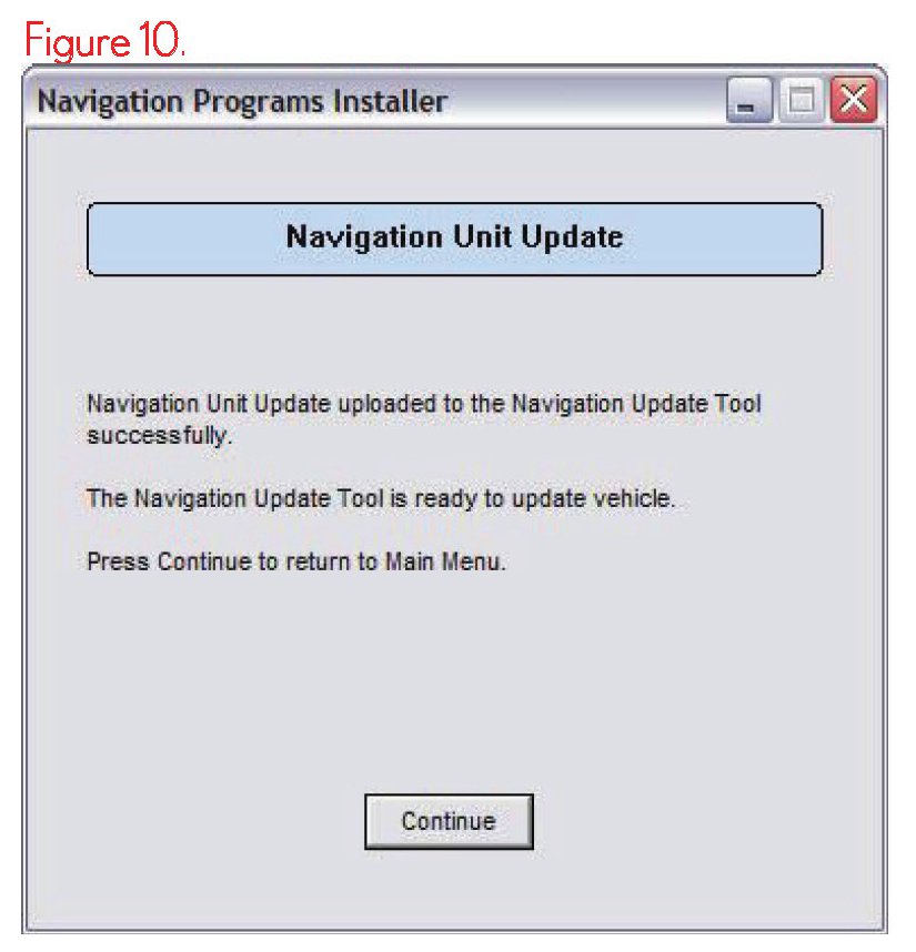 14. Once the Navigation Firmware is successfully loaded onto the Navigation Update Tool, Click Continue to finish the installer.