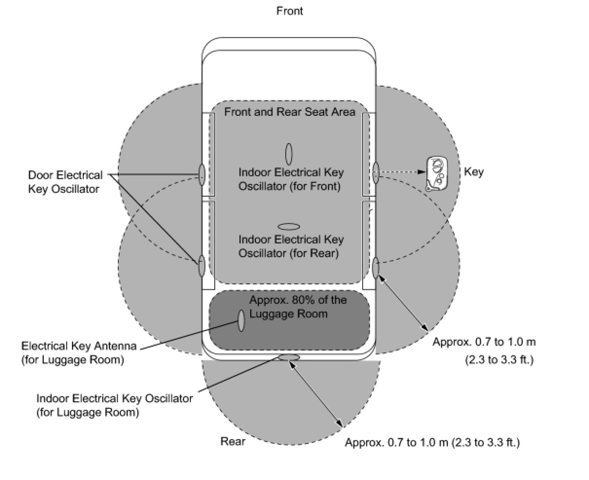 - The detection areas are formed by 7 oscillators and 1 antenna (4 door oscillators, 1 luggage compartment antenna, 1 luggage compartment oscillator, and 2 indoor oscillators).