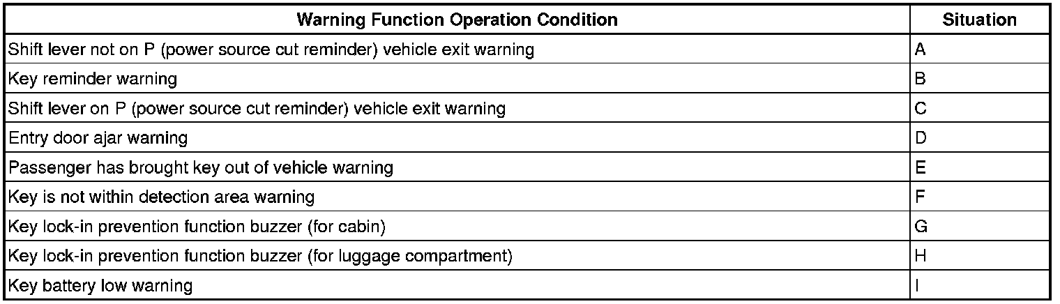When any of the situations below occur, the smart access system with push-button start responds to alert the driver.