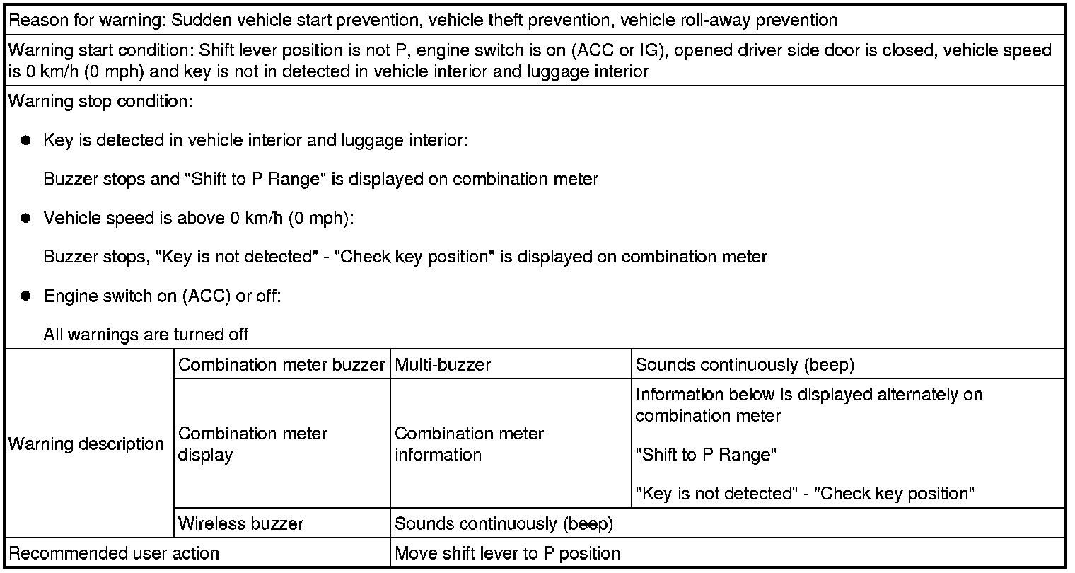 (1) With shift lever in position other than P, door is opened and vehicle exit (while holding key) is attempted