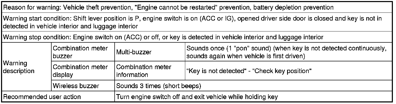 (1) With engine switch in position other than off, key is brought out of vehicle by passenger