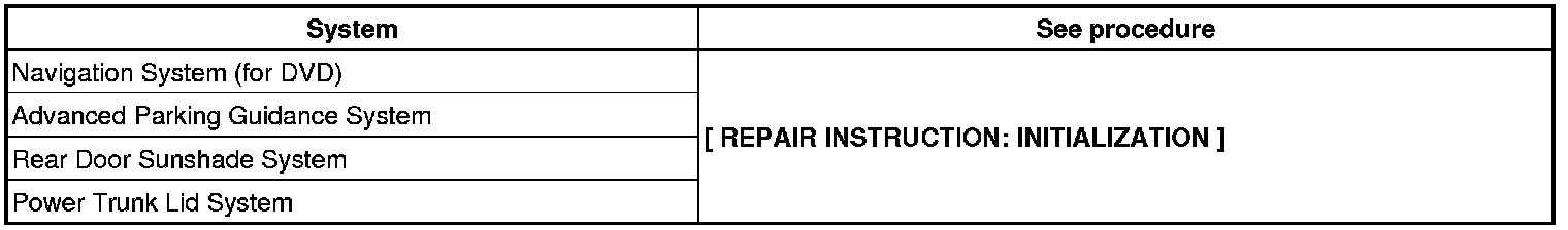 When disconnecting the cable from the negative (-) battery terminal, initialize the following systems after the cable is reconnected.