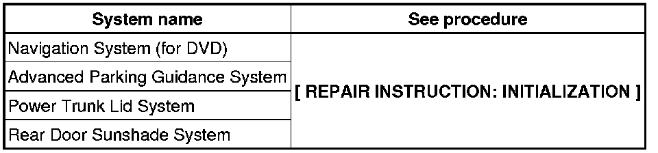 - When the cable is disconnected from the negative (-) battery terminal, initialize the following system(s) after the cable is reconnected.
