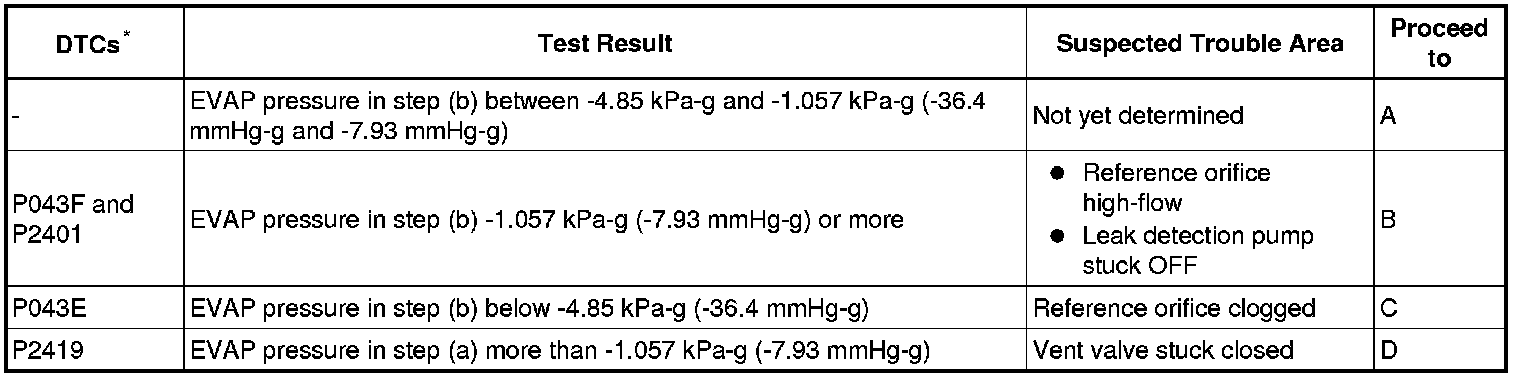 If the reference pressure difference between the first and second checks is greater than the specification, all the DTCs relating to the reference pressure (P043E, P043F, P2401, P2402 and P2419) are stored.