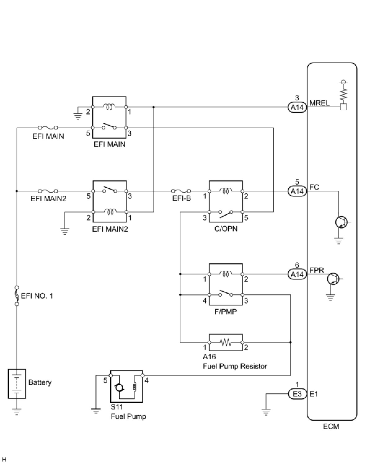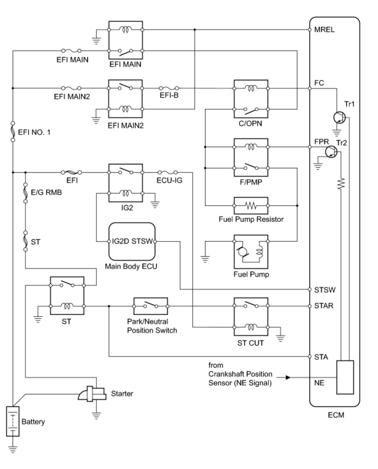 When the engine is cranked, a signal is sent from the main body ECU's STSW terminal to the ECM's STSW terminal. Then voltage travels from the ECM's STAR terminal through the park/neutral position switch to the ST relay coil. The STAR terminal also sends a signal to the STA terminal. When the STA signal and NE signal are input to the ECM, the ECM interior's Tr1 turns ON, which causes power to be supplied to the C/OPN relay coil (C/OPN ON). As a result, the F/PMP relay actuates, which causes the fuel pump to operate. If the engine is operating and NE signals are being output, the ECM interior's Tr1 is ON (C/OPN ON), and the fuel pump will continue operating. The fuel pump has a high and low speed setting. When the engine is starting or operating with a heavy load, the ECM interior's Tr2 turns ON to actuate the F/PMP relay so that the fuel pump operates at the high speed setting. When the engine is idling or operating with a light load, the Tr2 turns OFF, and current flows through the fuel pump resistor to the fuel pump so that the fuel pump operates at the low speed setting.