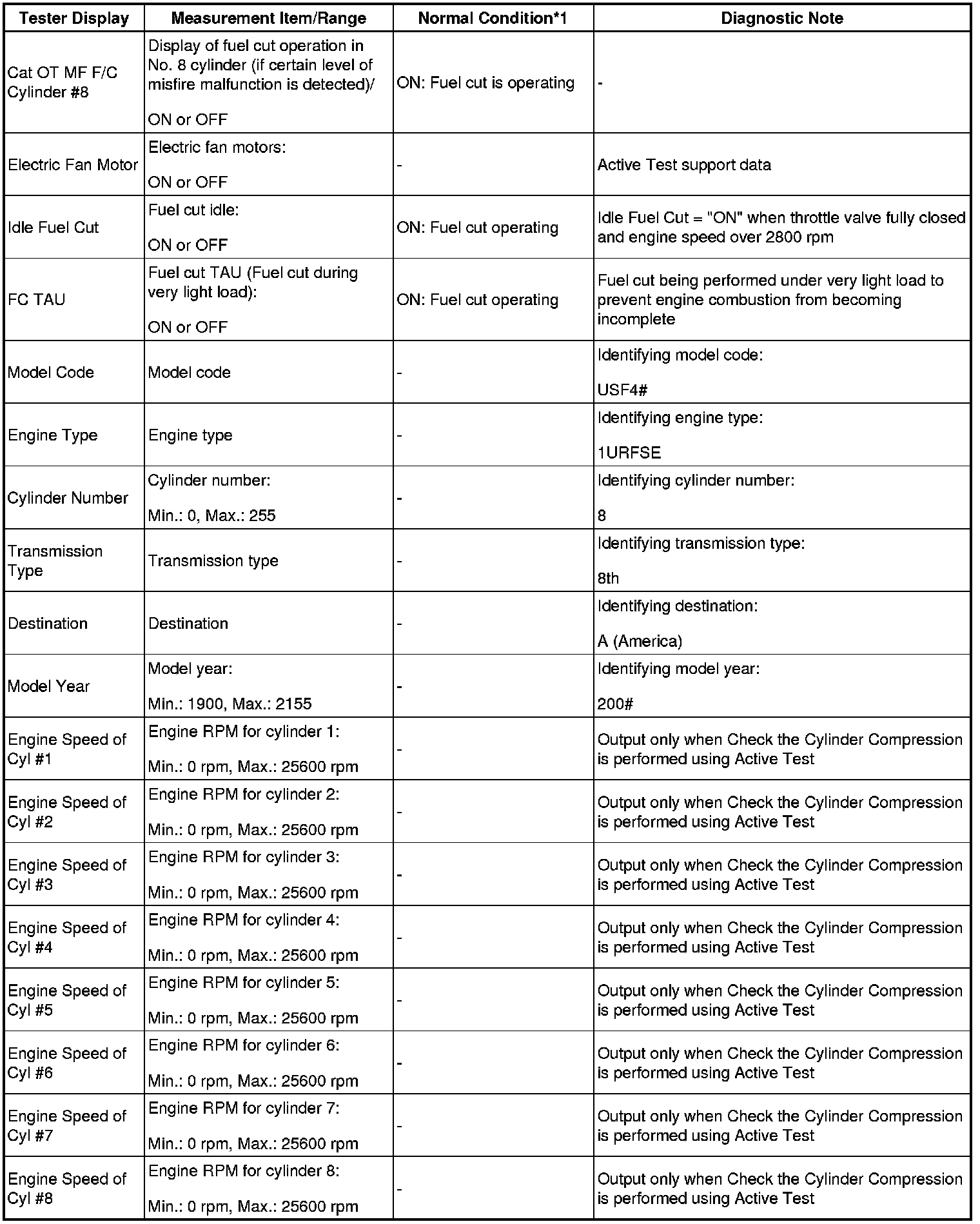 HINT: If the results are not displayed normally, select the display items from the Data List before performing the Active Test. Enter the following menus: Powertrain / Engine / Data List / Compression / Engine Speed of Cyl #1, Engine Speed of Cyl #2, Engine Speed of Cyl #3, Engine Speed of Cyl #4, Engine Speed of Cyl #5, Engine Speed of Cyl #6, Engine Speed of Cyl #7, Engine Speed of Cyl #8 and Av Engine Speed of All Cyl.