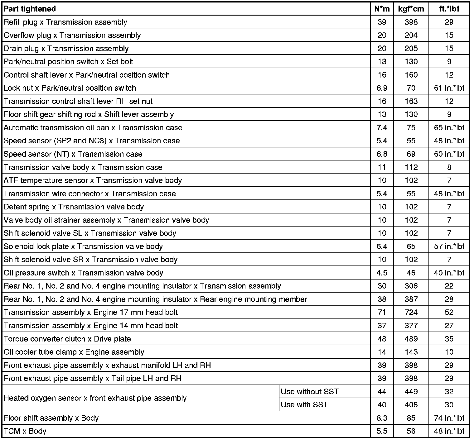 SERVICE SPECIFICATIONS: AA80F AUTOMATIC TRANSMISSION: TORQUE SPECIFICATIONS