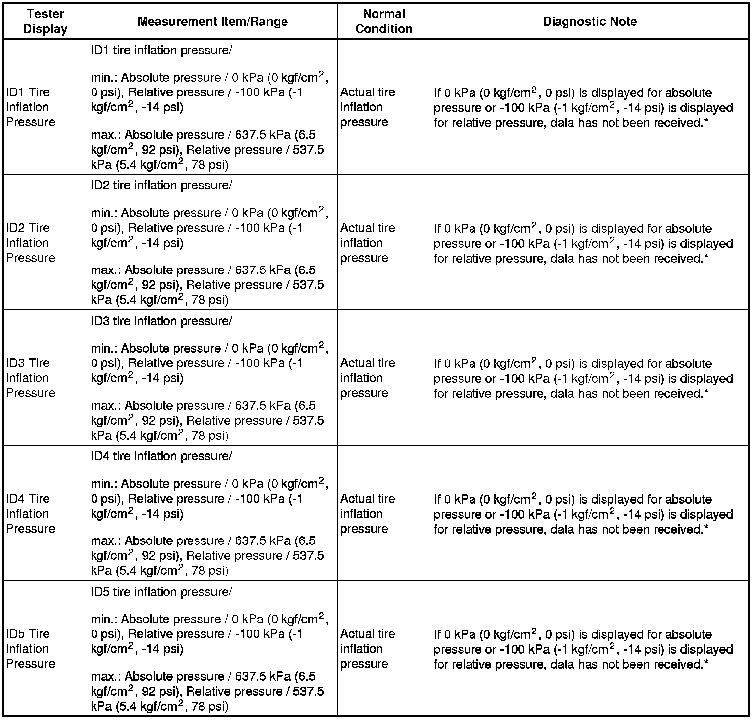 - The initialization is complete when the Data List "ID Tire Inflation Pressure" display shows the correct pressures.