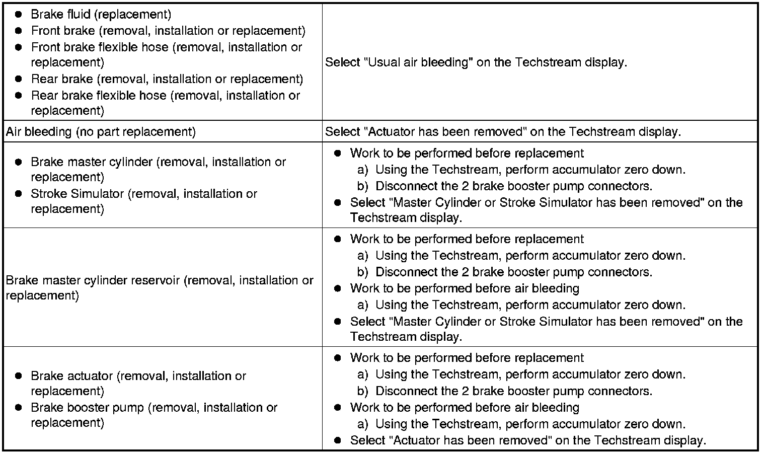 - Air bleeding with the Techstream cannot be performed when the engine switch is on (IG) or when the parking brake is not operating (electric parking brake operation signal is not input into skid control ECU).