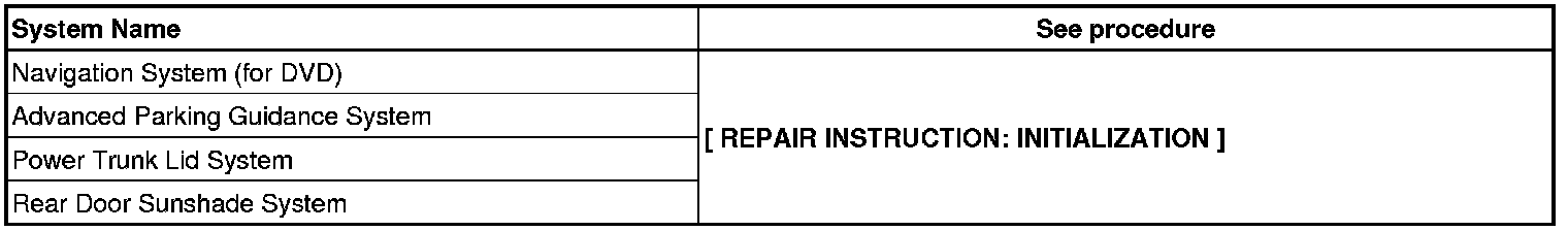 When disconnecting the cable from the negative (-) battery terminal, initialize the following systems after the cable is reconnected.