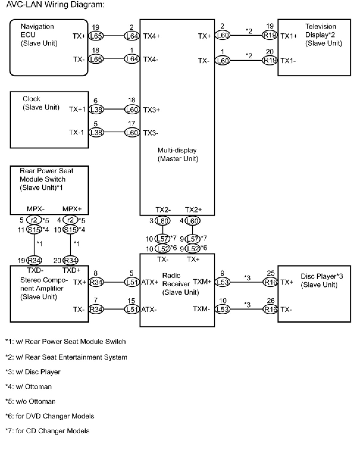 (a) Referring to the AVC-LAN wiring diagram below, check the AVC-LAN circuit between the rear power seat module switch and the component shown by the sub-code.
