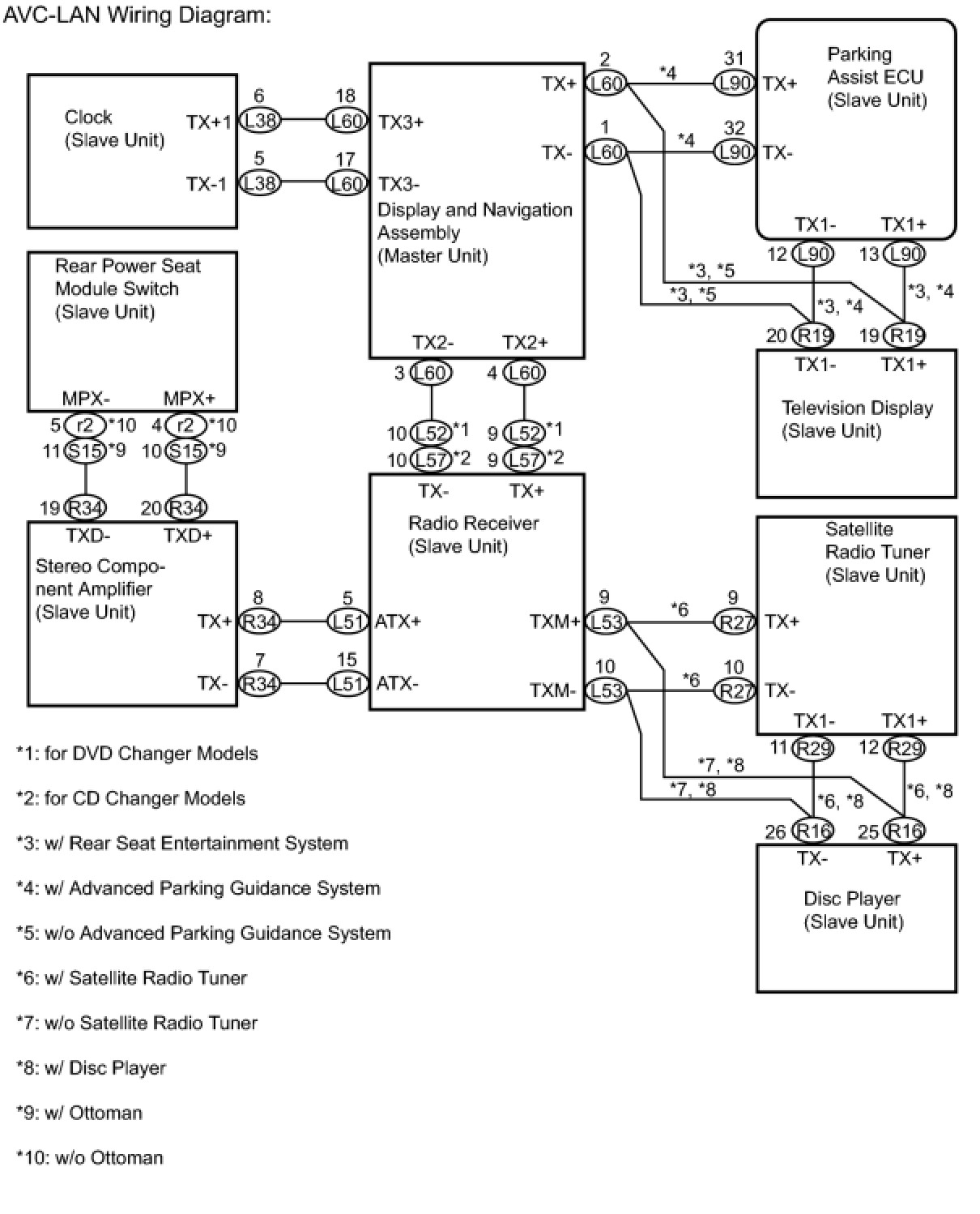 (a) Referring to the AVC-LAN wiring diagram below, check the AVC-LAN circuit between the display and navigation assembly and the component shown by the sub-code.