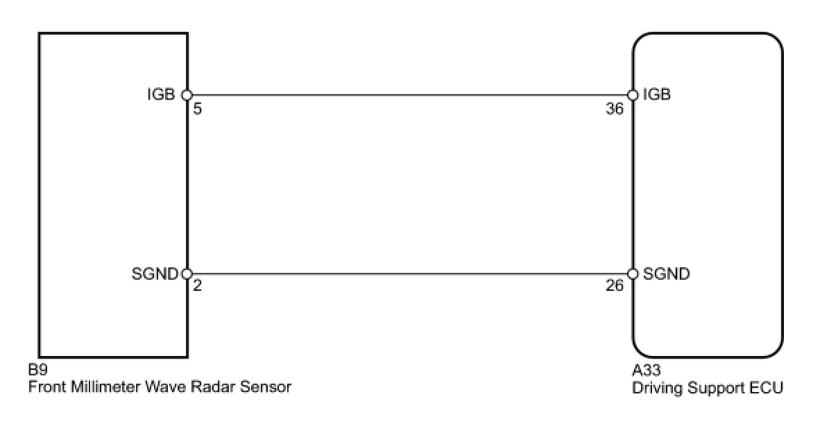 This circuit provides power to the front millimeter wave radar sensor. The front millimeter wave radar sensor emits radio waves towards an object in front and measures the distance and direction of the object by receiving the beam reflections. Based on the reflections, the sensor calculates the difference in speed between the vehicle and the object in front. This data is transmitted to the driving support ECU.